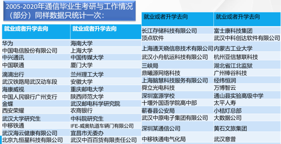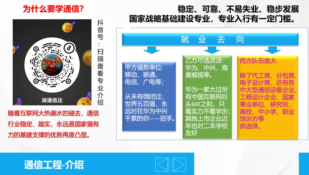 本专业培养通信领域基础理论与专业知识,具备良好的学习能力、良好的通信工程实践能力、项目管理能力和创新创业能力,可从事新通信(ICT)软硬件开发和管理的应用型工程人才,毕业生就业于各大运营商、中兴通讯、平安银行、富士通、各大银行等单位,考研入985、211名校或研究所,之后去向华为、天猫、海康等企业毕业生居多。