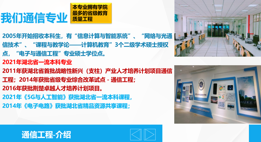 通信工程(非师范类四年制本科授予工学学士学位)是湖北省一流本科专业、战略性新兴(支柱)产业计划项目、湖北省专业综合改革试点项目、荆楚卓越人才培养计划所在专业,与国家战略保持高度一致,其前沿性决定其稳定性。