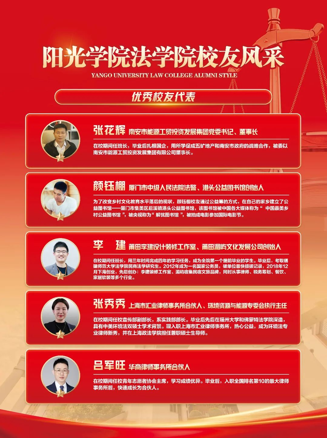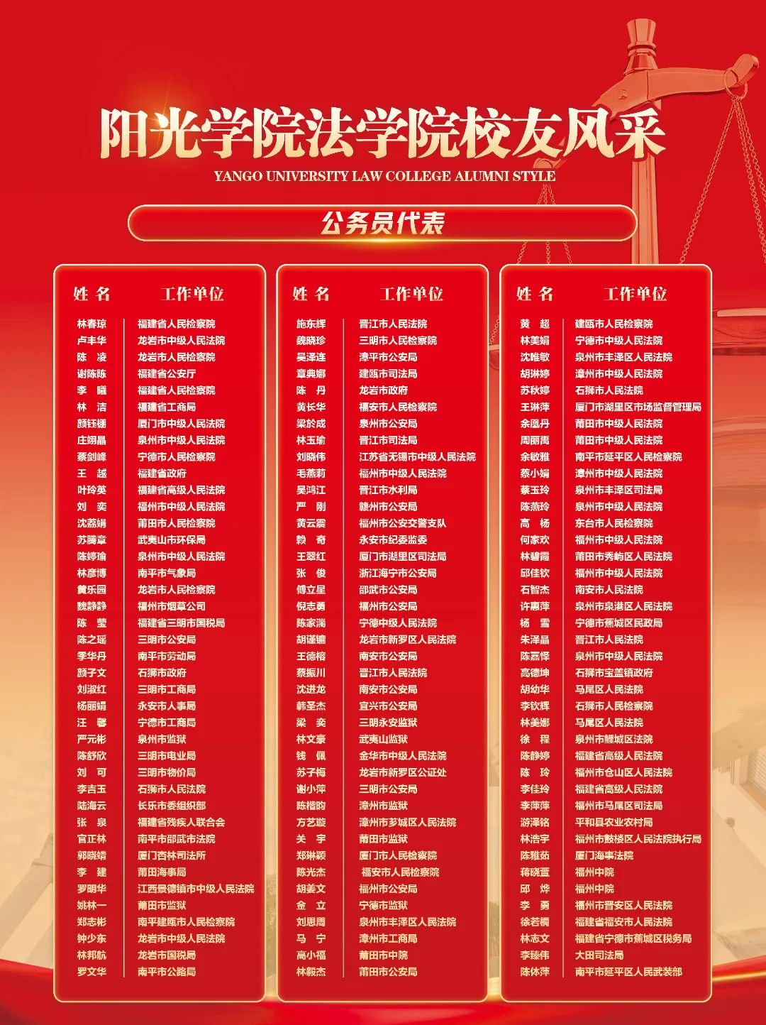 近年来学生高质量就业率名列学校各专业前茅。已有500多名校友就职于各地法院、检察院、行政机关等单位,600多名校友就职于各地律师事务所。荣获阳光学院“就业工作先进单位”。