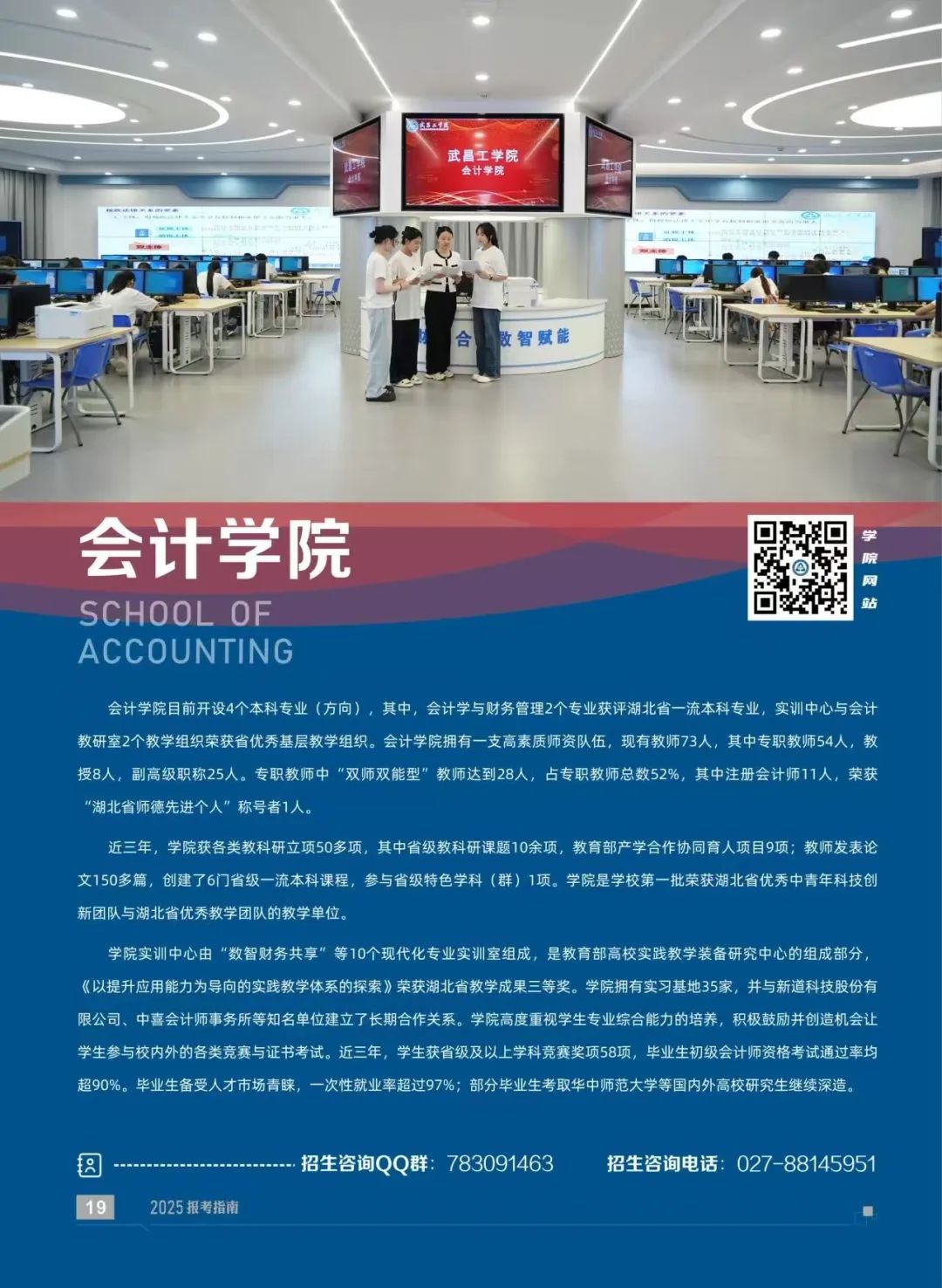 会计学院目前开设4个本科专业(方向),其中,会计学与财务管理2个专业获评湖北省一流本科专业,实训中心与会计教研室2个教学组织荣获省优秀基层教学组织。会计学院拥有一支高素质师资队伍,现有教师73人,其中专职教师54人,教授8人,副高级职称25人。专职教师中“双师双能型”教师达到28人,占专职教师总数52%,其中注册会计师11人,荣获“湖北省师德先进个人”称号者1人。