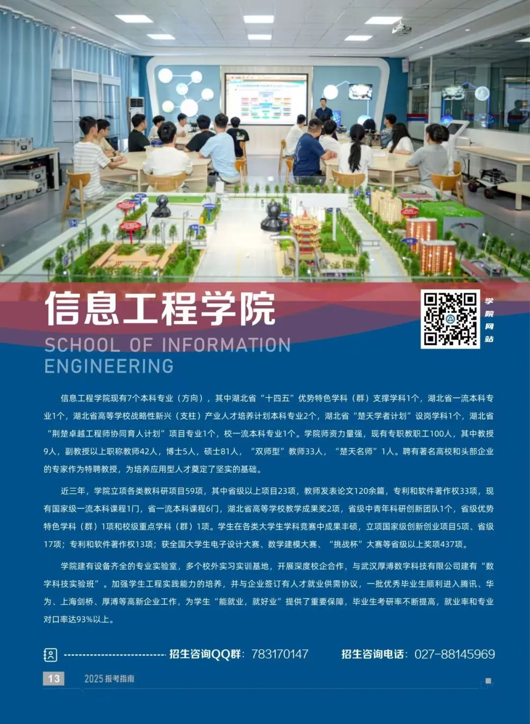 信息工程学院现有7个本科专业(方向),其中湖北省“十四五”优势特色学科(群)支撑学科1个,湖北省一流本科专业1个,湖北省高等学校战略性新兴(支柱)产业人才培养计划本科专业2个,湖北省“楚天学者计划”设岗学科1个,湖北省“荆楚卓越工程师协同育人计划”项目专业1个,校一流本科专业1个。学院师资力量强,现有专职教职工100人,其中教授9人,副教授以上职称教师42人,博士5人,硕士81人,“双师型”教师33人,“楚天名师”1人。聘有著名高校和头部企业的专家作为特聘教授,为培养应用型人才奠定了坚实的基础。