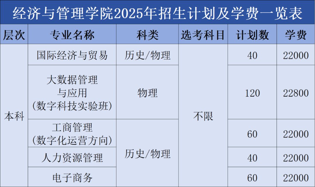 经济与管理学院开设5个本科专业,其中工商管理专业为湖北省一流本科专业,大数据管理与应用、电子商务和人力资源管理专业是湖北省优势特色学科(群)重点建设专业,国际经济与贸易是学校一流本科专业。学院拥有由专职老师、企业高管和名校专家共同组成的跨界师资队伍,其中包括楚天学者1名,教授11人、博士14人、副高级职称教师31人,双师型教师占比超过50%。此外,学院还建有湖北省“十四五”优势特色学科(群)、“十二五”重点学科、“楚天学者计划”设岗学科和综合改革试点专业各1个,省级一流本科课程7门;获评湖北省优秀教学成果三等奖2项、优秀基层教学单位2个、科技创新团队1个。
