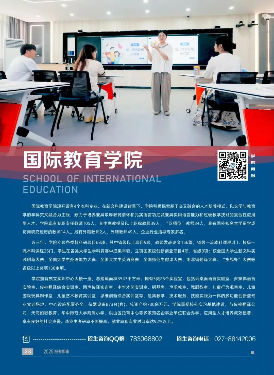 国际教育学院现开设有4个本科专业。在新文科建设背景下,学院积极探索基于交叉融合的人才培养模式,以文学与教育学的学科交叉融合为主线,致力于培养兼具浓厚教育情怀和扎实语言功底及兼具实用语言能力和过硬教学技能的复合性应用型人才。学院现有专职专任教师105人,其中副教授及以上职称教师39人,“双师型”教师34人,具有国外知名大学留学或访问研究经历的教师14人。另有外籍教师2人,外聘教师49人,企业行业指导专家多名。
