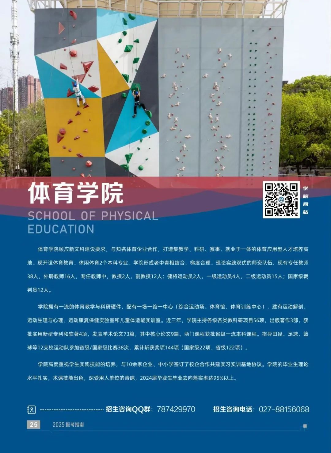 学校学科特色鲜明、优势突出,形成了以工学为主,工学、管理学、经济学、文学、艺术学、教育学六大学科门类协调发展的学科布局,现有智能制造学院、信息工程学院、城市建设学院、经济与管理学院、会计学院、艺术设计学院、国际教育学院、体育学院、马克思主义学院、创新创业学院等10个学院。学校面向区域经济发展设置专业,目前开办有31个本科专业,拥有省级优势特色学科(群)2个,湖北省重点(培育)学科1个,楚天学者计划设岗学科4个。获批湖北省一流本科专业建设点7个,省级首批重点培育本科专业1个,湖北省转型发展试点专业2个,湖北省本科高校“专业综合改革试点”项目2个。学校学科专业建设成效明显,在全省同类高校处于领先地位。