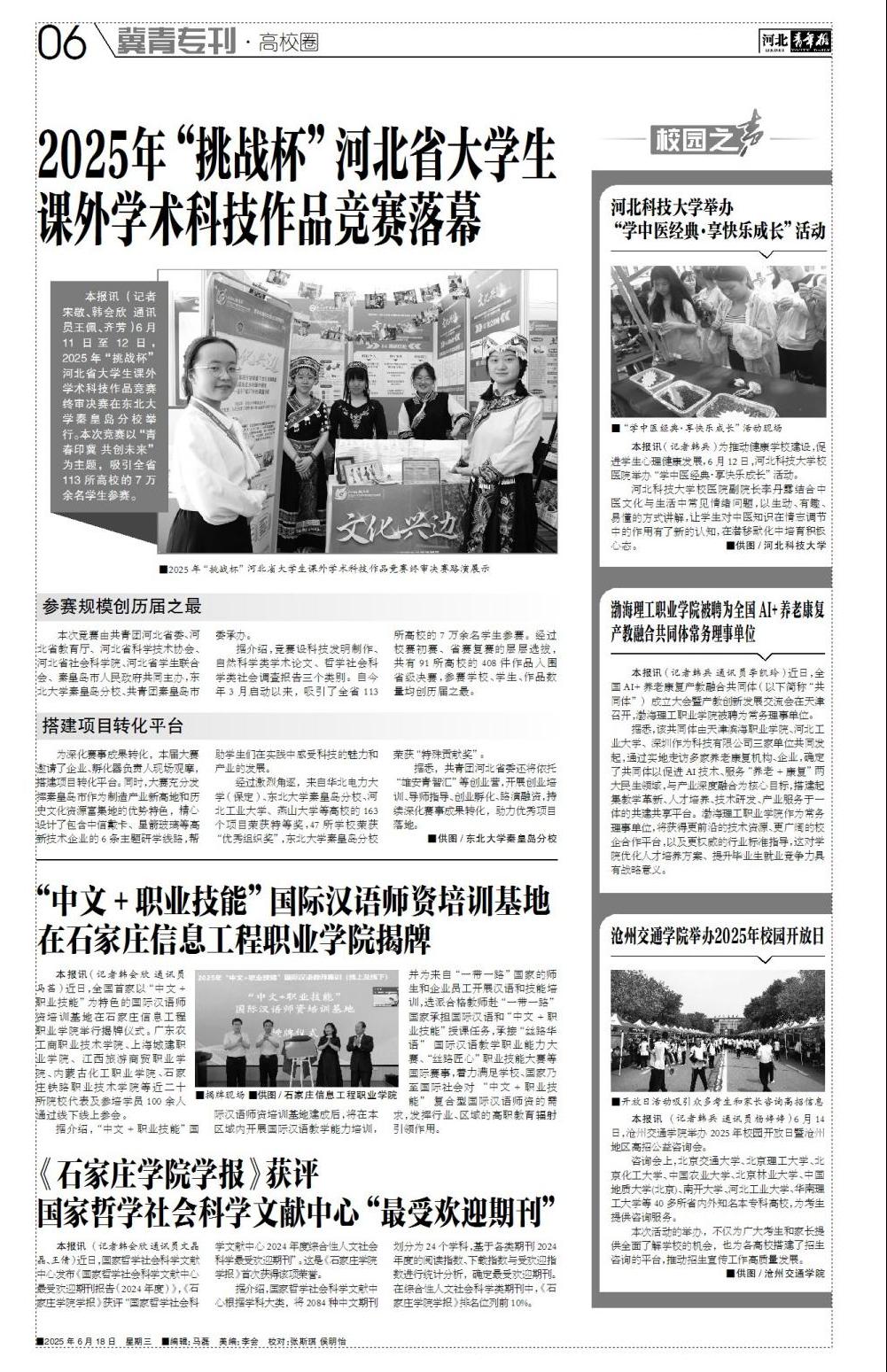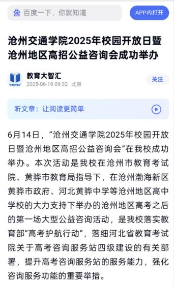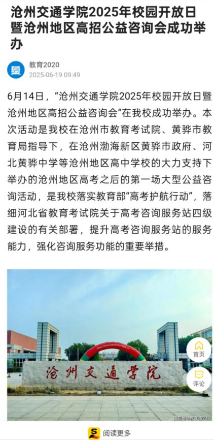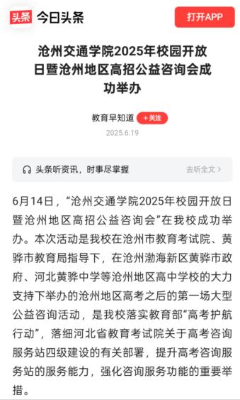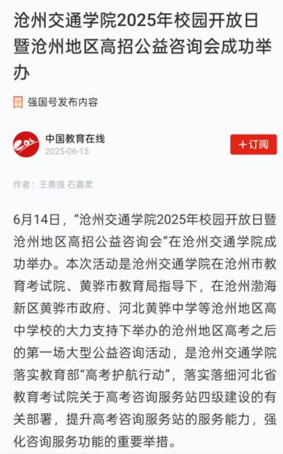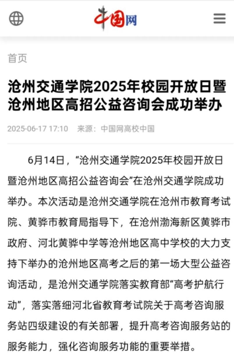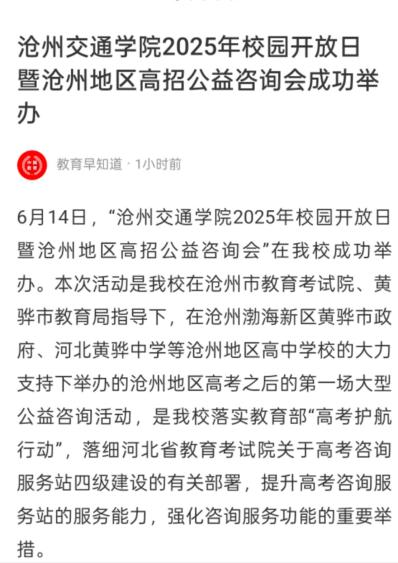近日,河北卫视《你好京津冀》和《冀时全播报》、河北公共频道《新闻6号线》、中国教育在线、中国网、河北青年报、百度、今日头条、一点资讯、搜狐等主流媒体平台报道我校2025年校园开放日暨沧州地区全国高校公益咨询活动。