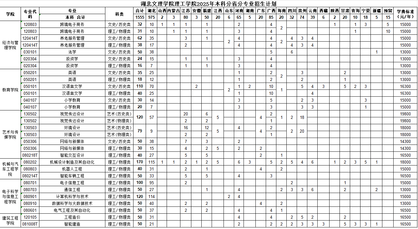 湖北文理学院理工学院2025年本科分省分专业招生计划