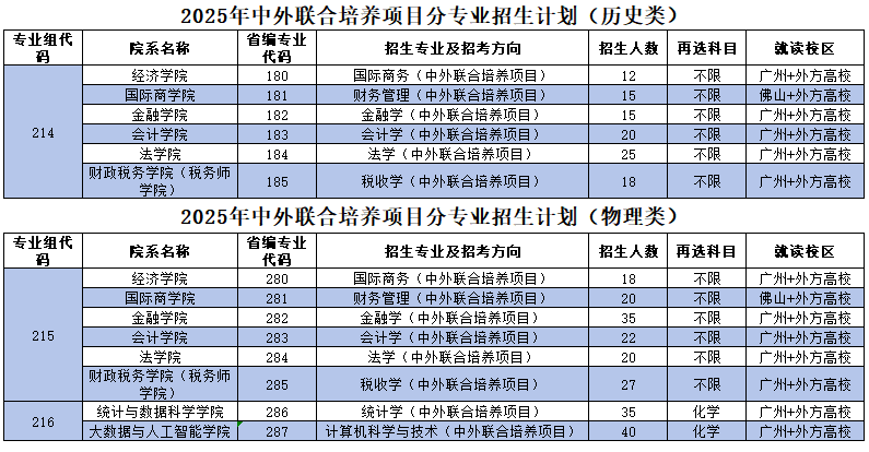 中外联合培养项目是指以全日制本科生为培养对象,与国外合作高校开展的学分互认联合培养学历教育项目。招生对象面向广东省普通夏季高考考生,专门设置物理类/历史类3个专业组进行招生。