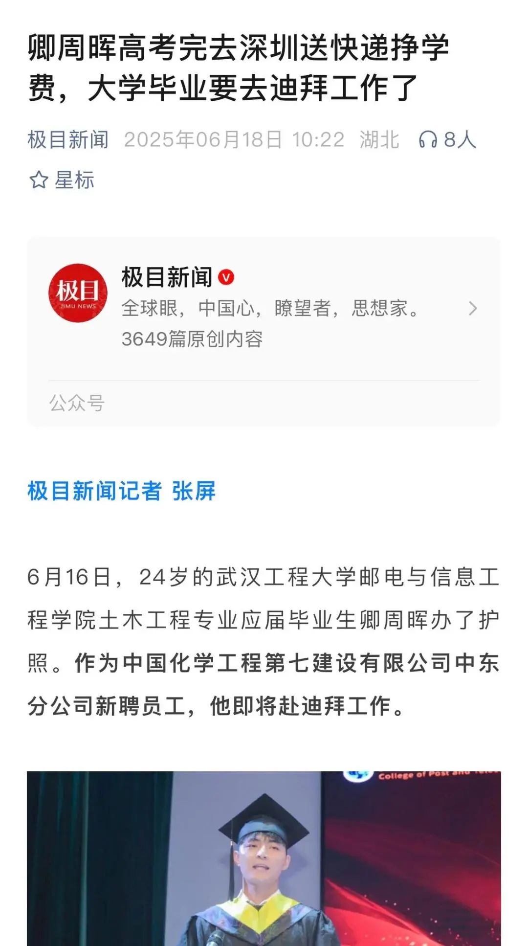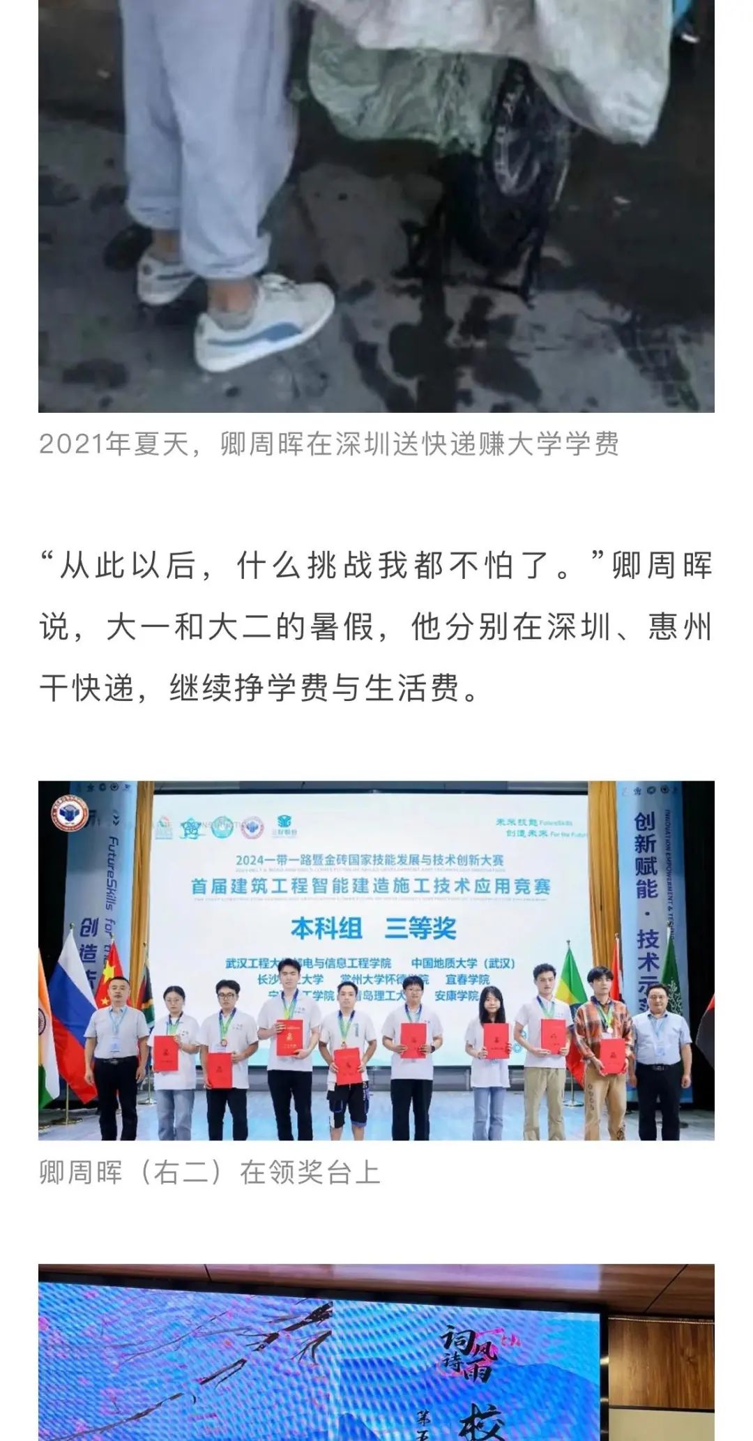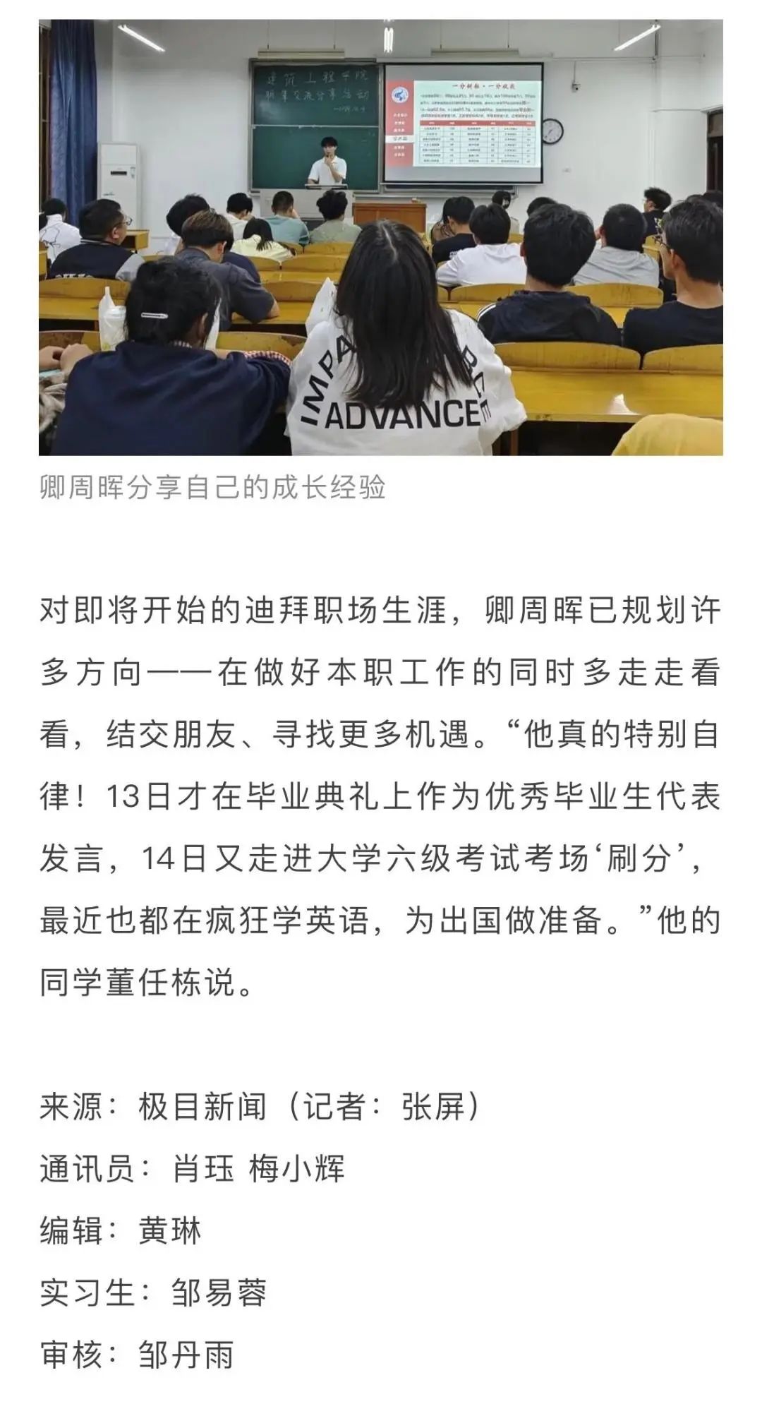极目新闻、红网、邵阳发布等多家微信公众号媒体报道了我院卿周晖同学高考后送快递挣学费、自律自强终获迪拜高薪工作的励志事迹,展现了他坚韧拼搏与全面发展的青春力量,为广大学子树立了榜样!