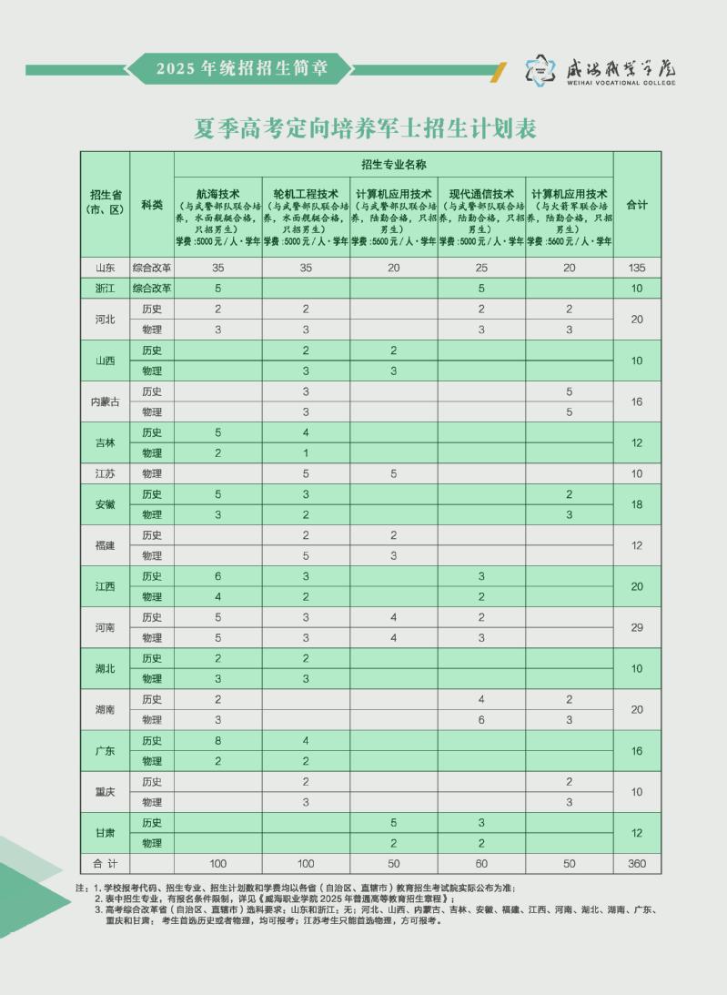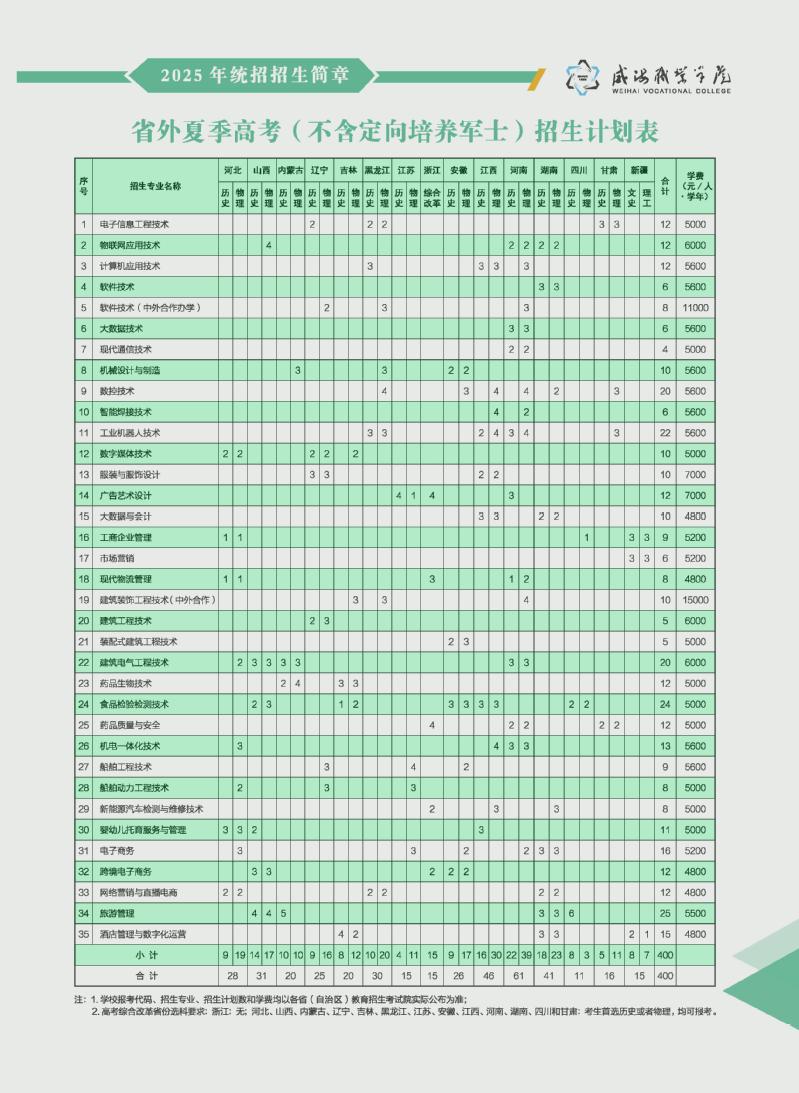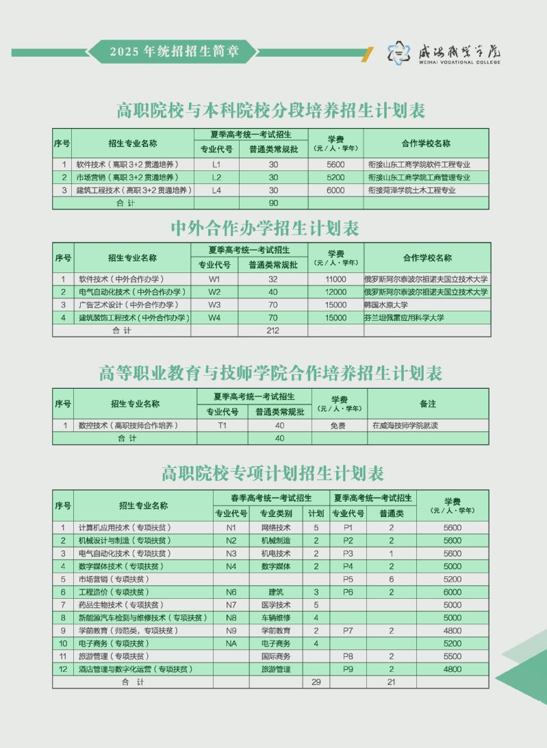 威海职业学院2025年春季和夏季高考统一考试招生计划表(分类别)