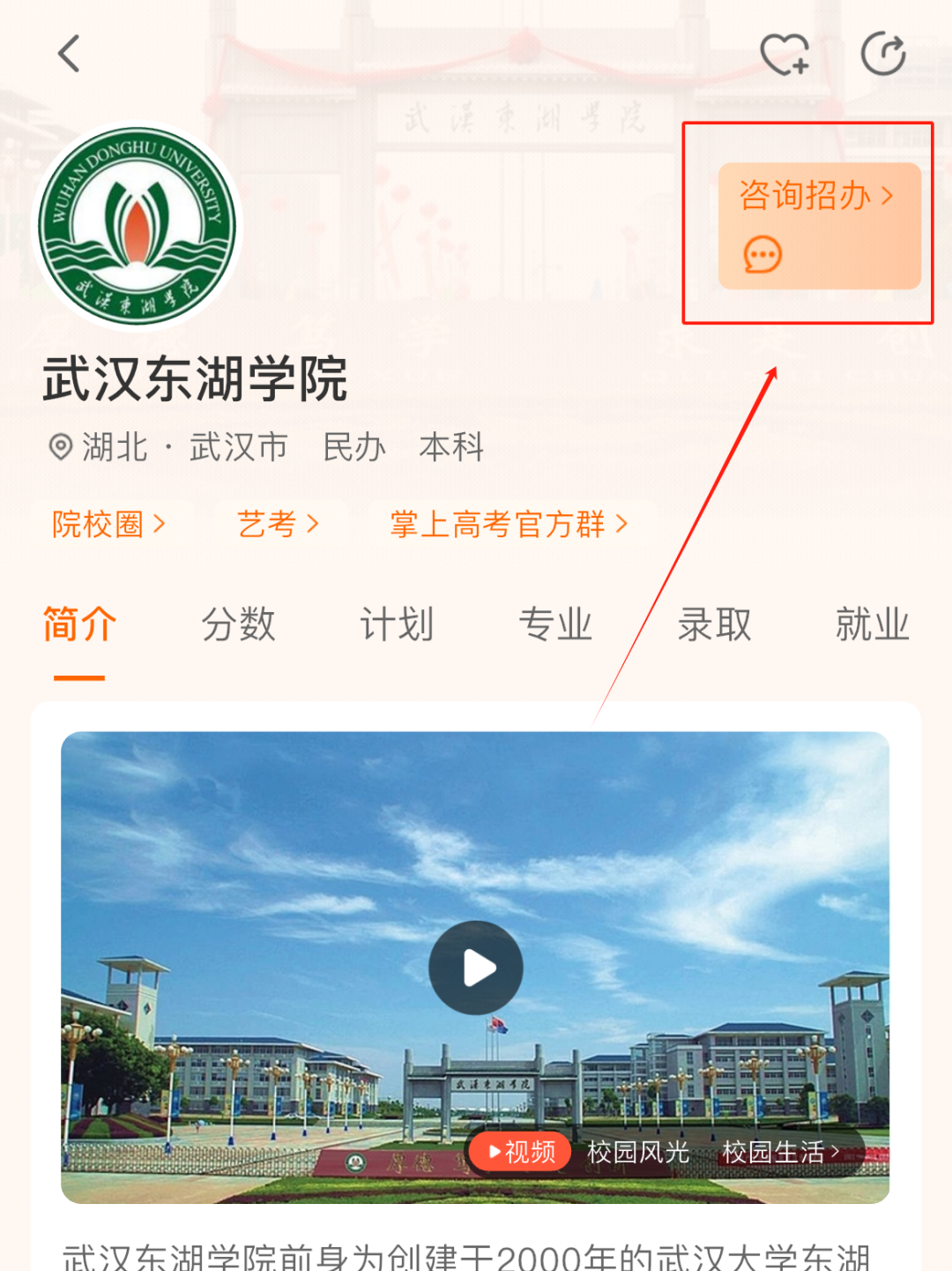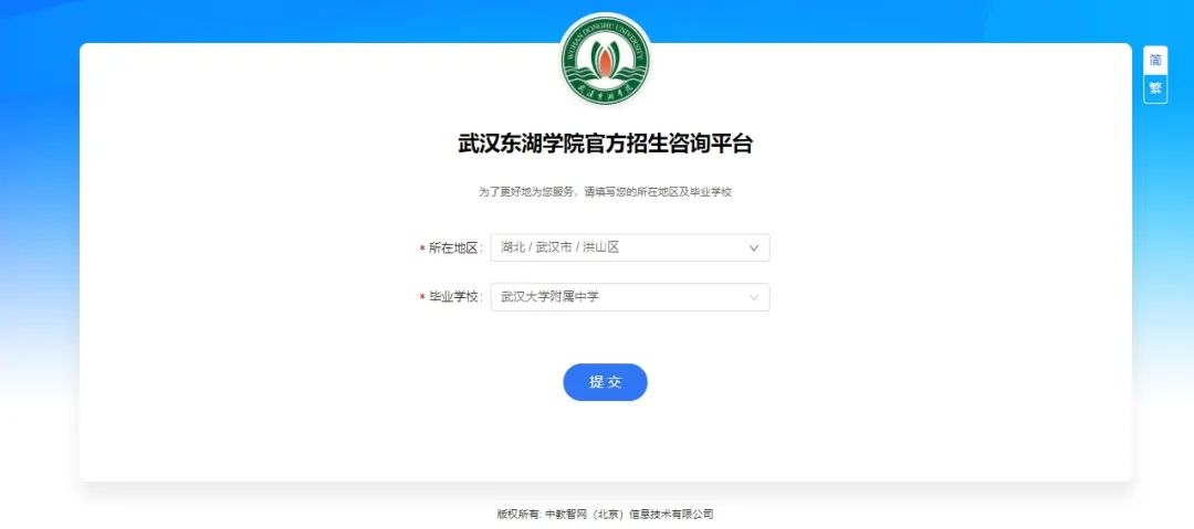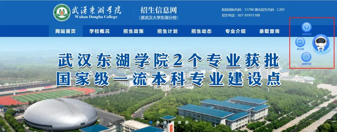 在武汉东湖学院招生信息网点击右侧“智能机器人小E”,在登录界面完善基础信息后即可在线咨询或留言。