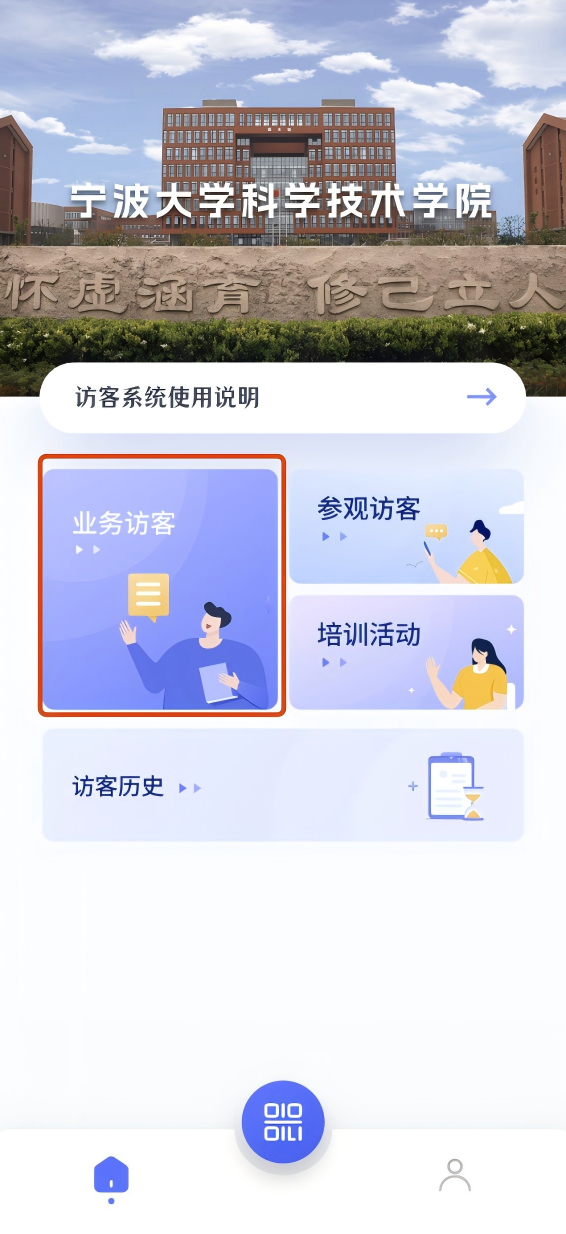 2、访客系统操作流程:关注“宁波大学科学技术学院"微信公众号,点击左下角日常校务-访客申请,②)注册成功后进入访客系统,点击业务访客申请,如实填写拜访开始时间、结束时间(时间请勿填写超过两天),拜访部门选择教务部/招生办公室,拜访对象选择蒋良波或张佳文,拜访事由:招生咨询,禁行区域填否,访问校区填本部校区(北区)。