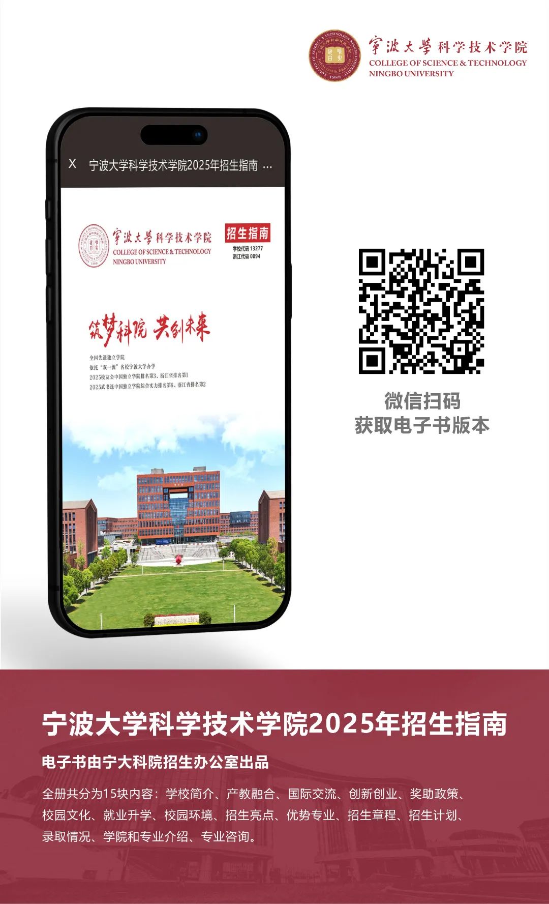 为帮助广大考生及家长全面了解宁波大学科学技术学院2025年招生政策,科学规划志愿填报与学业发展,我校正式发布《宁波大学科学技术学院2025年招生指南》。该指南提供以下两种获取方式: