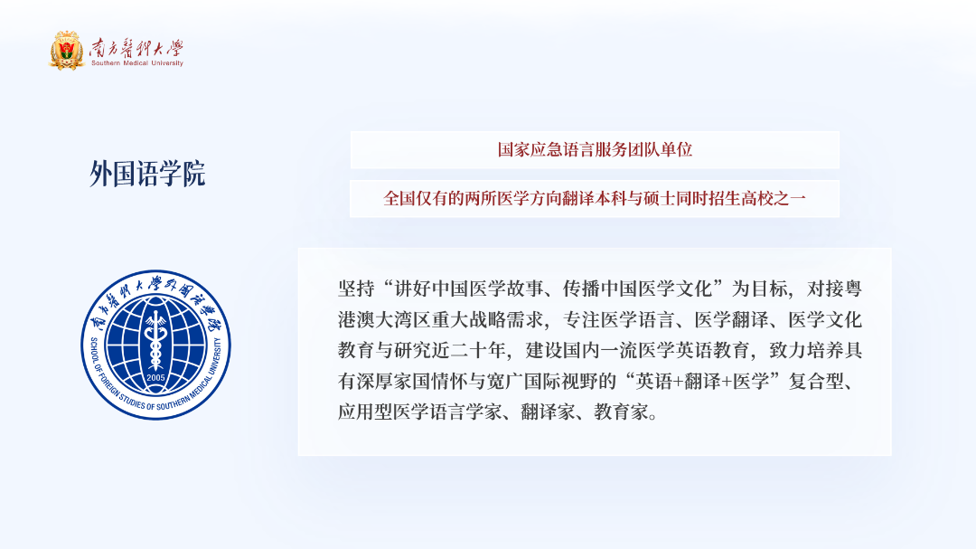 外国语学院现设英语系、翻译系(MTI教育中心)和公共英语教学部三个教学机构,以及医学语言与文化研究所、医学语言服务中心。学院坚持“讲好中国医学故事、传播中国医学文化”为目标,对接粤港澳大湾区重大战略需求,专注医学语言、医学翻译、医学文化教育与研究二十年,建设国内一流医学英语教育,致力培养具有深厚家国情怀与宽广国际视野的“英语+翻译+医学”复合型、应用型医学语言学家、翻译家、教育家。