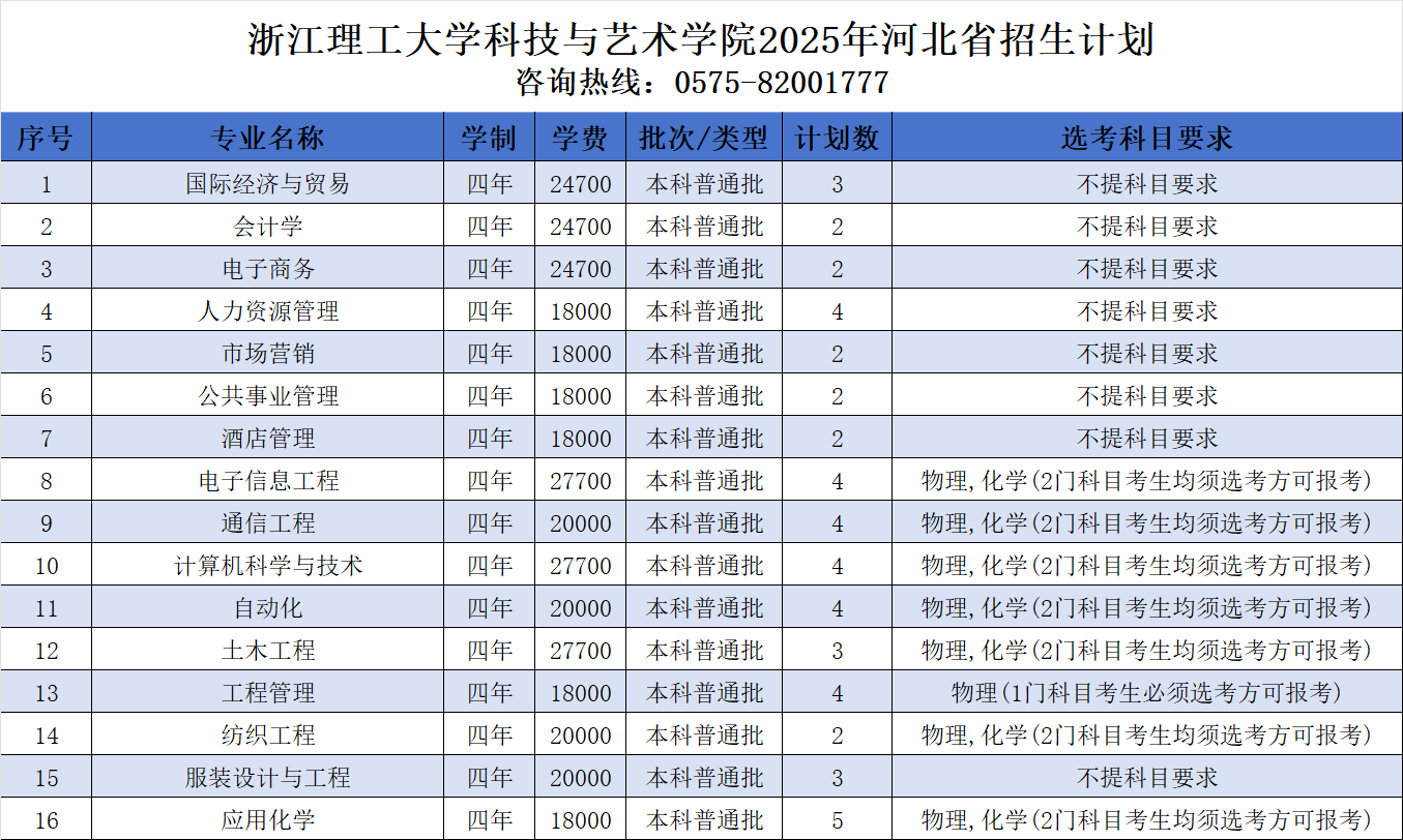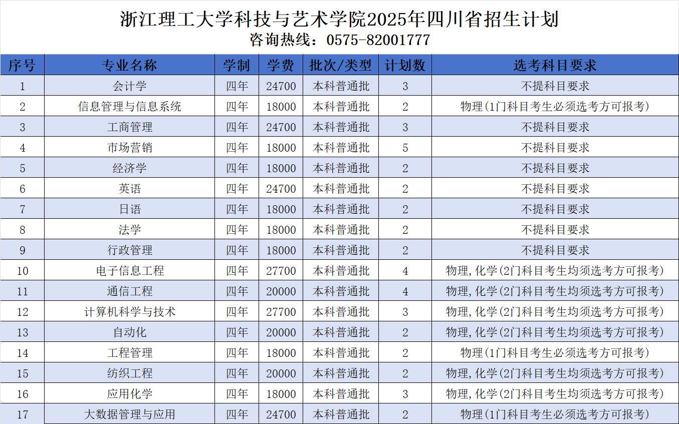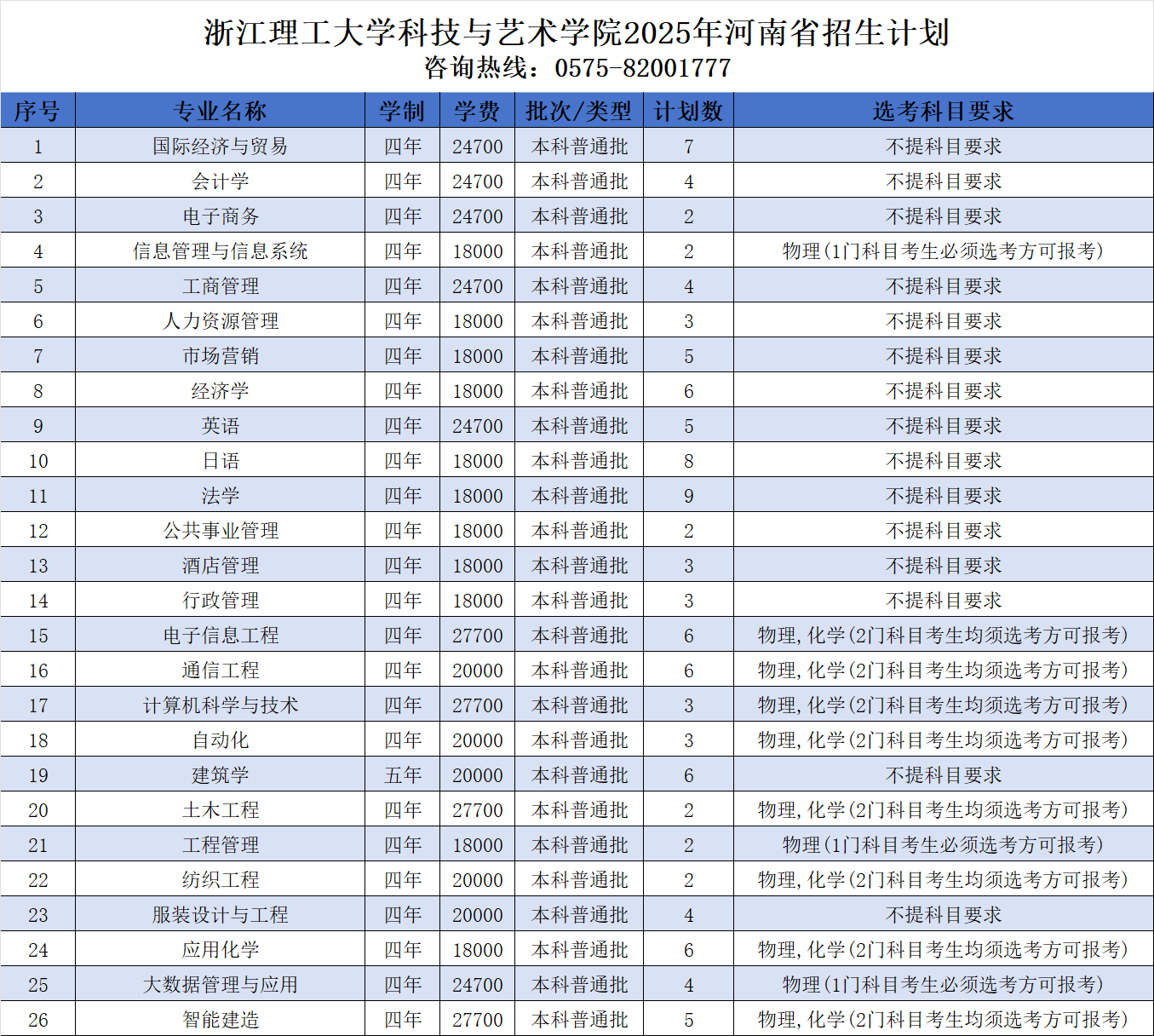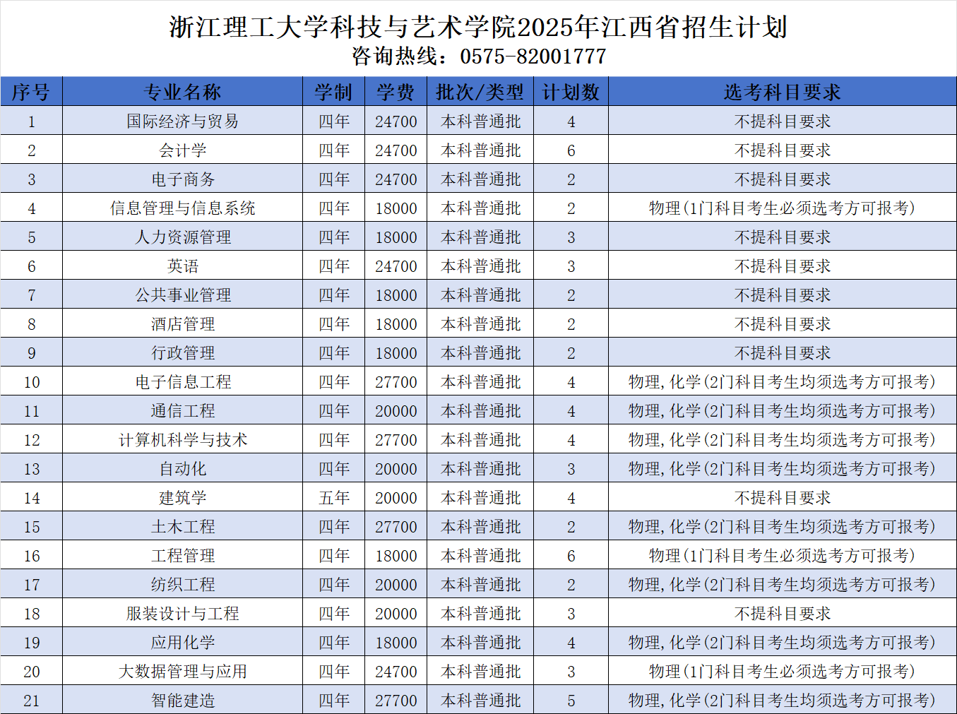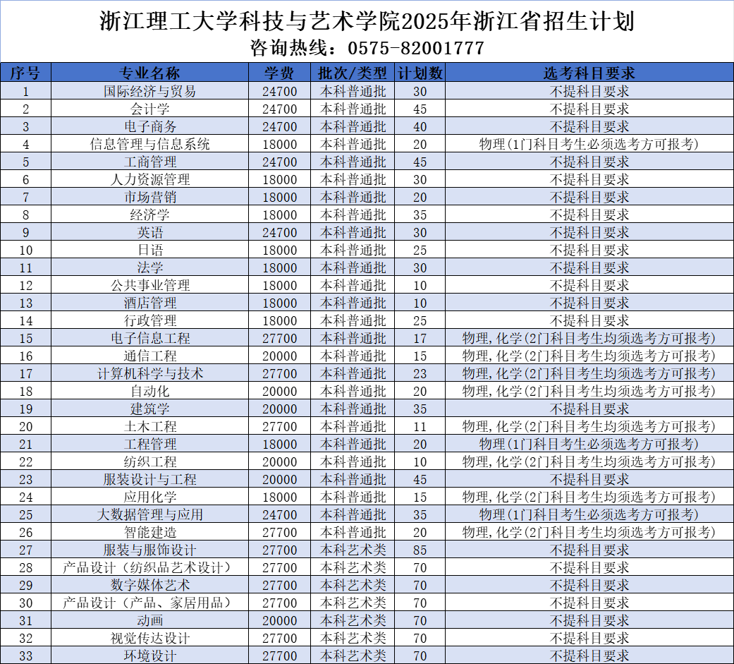 浙江理工大学科技与艺术学院2025年分省分专业招生计划