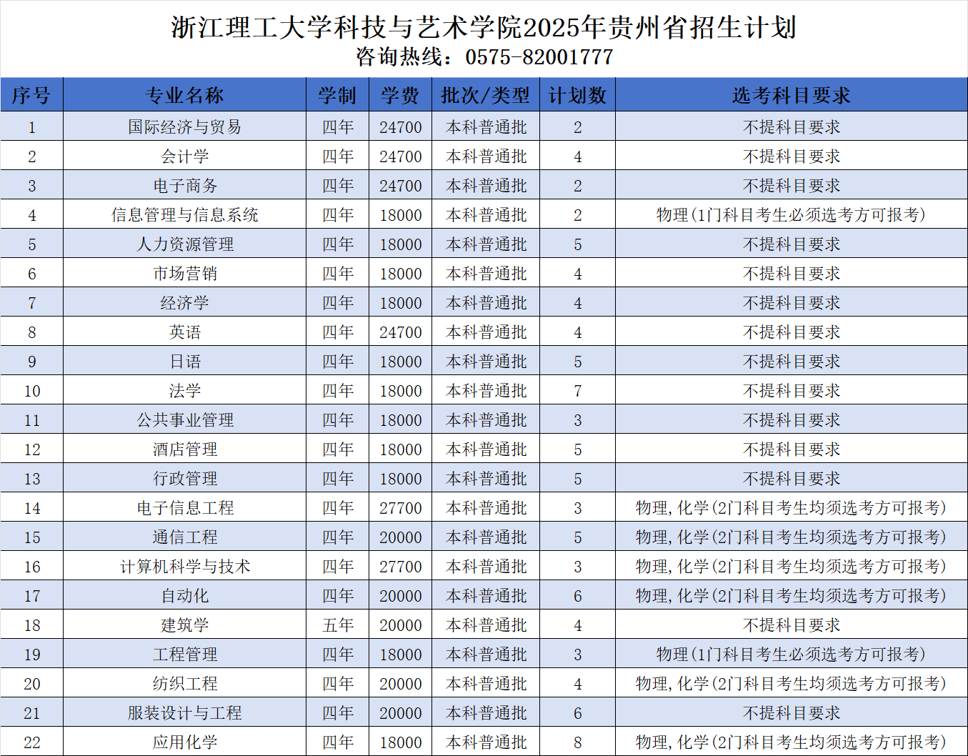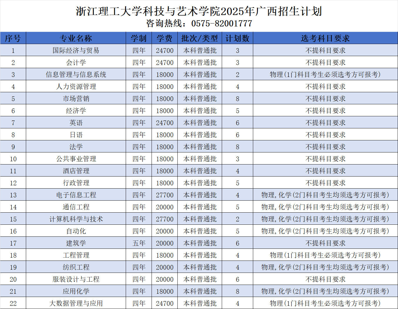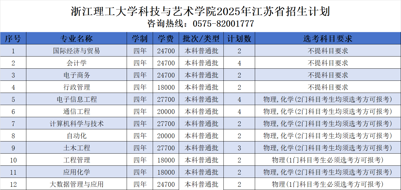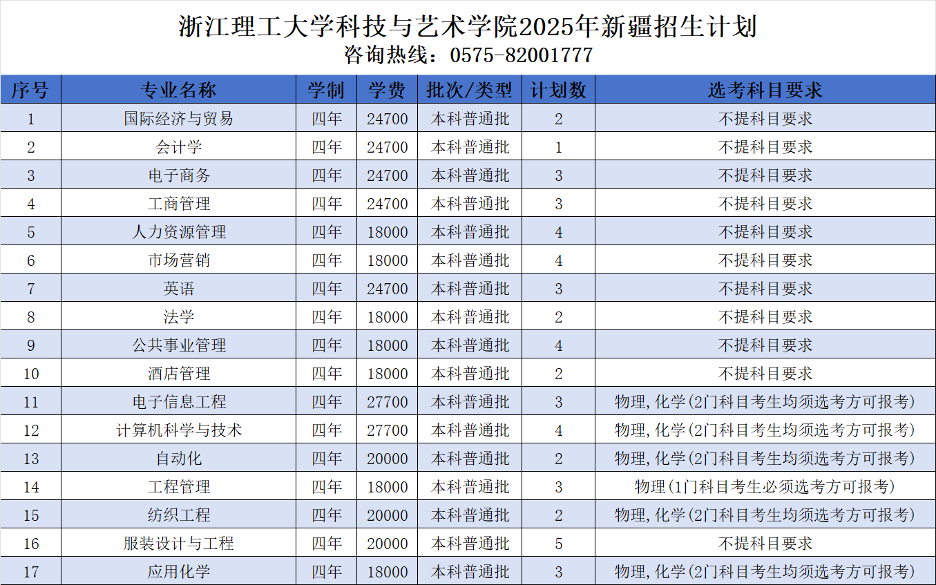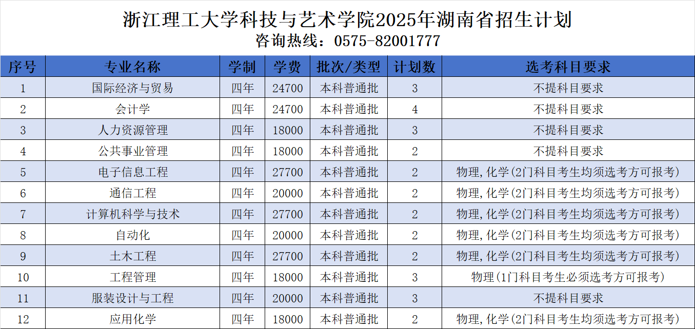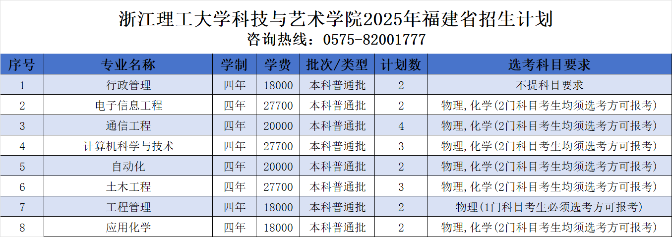 浙江理工大学科技与艺术学院2025年分省分专业招生计划
