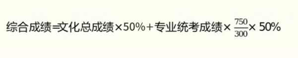 使用省级专业统考成绩作为专业考试成绩的艺术类专业,在考生高考文化成绩(含录取照顾政策加分)、省级专业统考成绩分别达到我省录取控制分数线后,根据考生综合成绩排序确定位次。综合成绩计算公式为: