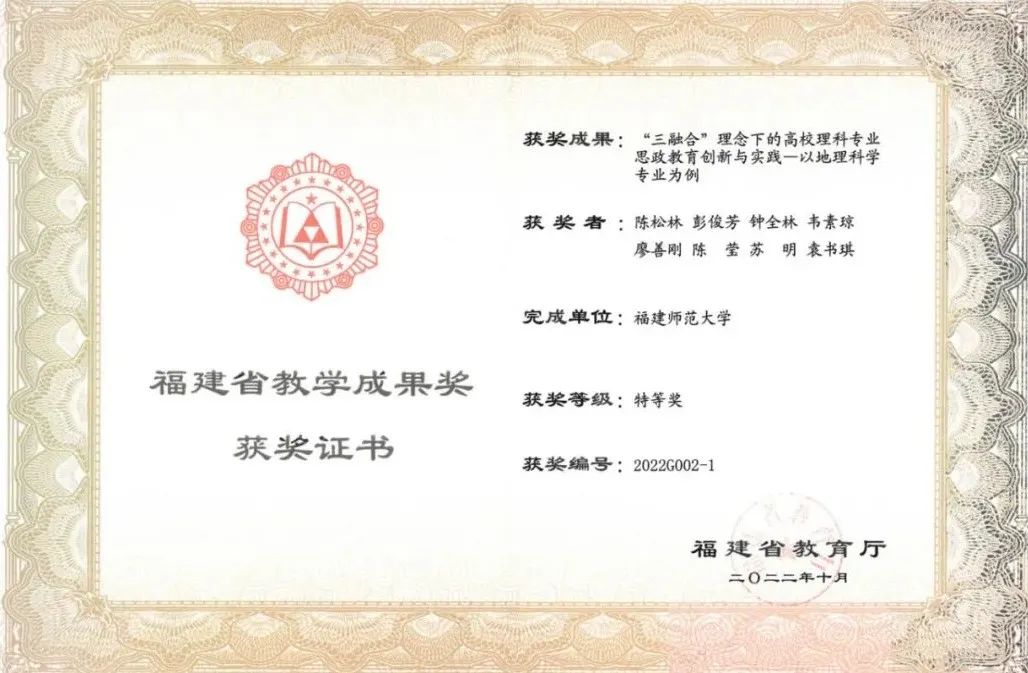 近年来,学院获评国家级虚拟仿真实验教学一流课程2门、国家级一流本科专业建设点2个,省级一流本科专业建设点3个,学院5个本科专业实现了一流本科专业全覆盖;加强课程思政课程建设,获评省级课程思政示范课程1门、校级课程思政示范课程11门、校级课程思政优秀案例6项;参与的教学成果获国家级教学成果二等奖1项,获评省级教学成果奖特等奖1项;获福建省高校教师教学创新大赛二等奖2项、三等奖1项,福建省高校青年教师教学竞赛一等奖1项、二等奖1项;获福建省“十四五”普通高等教育本科规划教材建设项目4项;获批省级教学改革重大项目6项、一般项目4项、校级教学改革项目16项;省级闽台高校联合培养人才示范项目1项,地理学国家级实验教学示范中心顺利通过检查验收并获得好评。