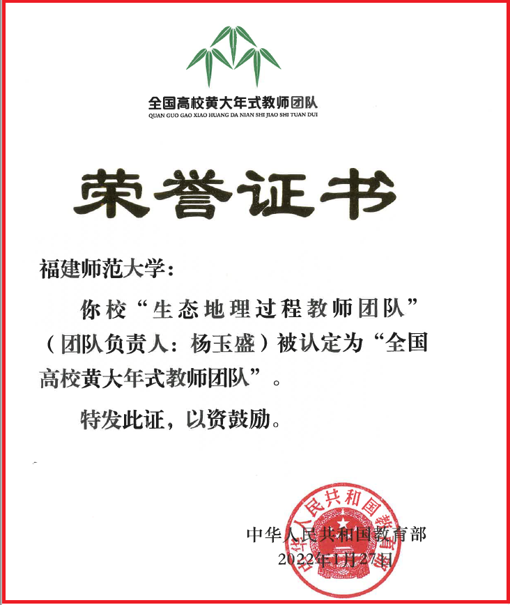 杨玉盛教授领衔的“生态地理过程教师团队”入选第二批“全国高校黄大年式教师团队”