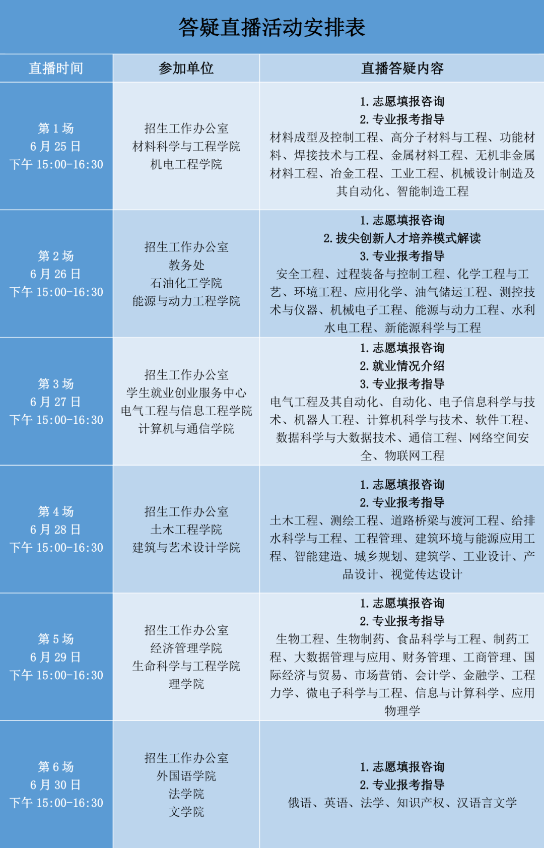 2025年高考填报志愿即将开始,为进一步做好考生服务,助力考生及家长进一步了解院校专业、掌握志愿填报方法,兰州理工大招生工作办公室推出兰理工“招办+”系列直播活动,特别邀请学院各专业教授及学校教务、就业等相关部门老师在志愿填报期间做客官方视频号,6月25日-6月30日连续为大家带来6场志愿填报指导和专业学习答疑直播。
