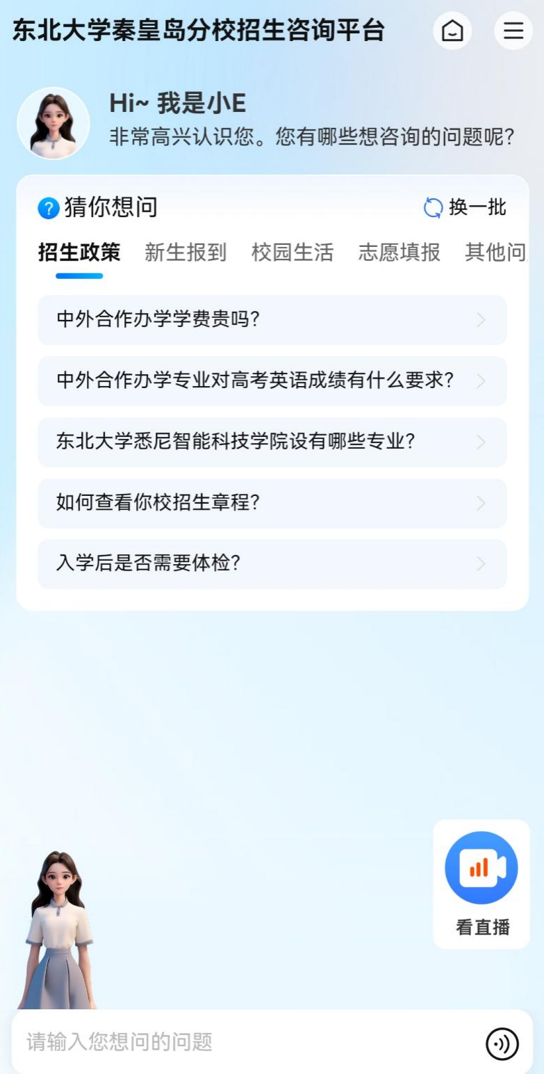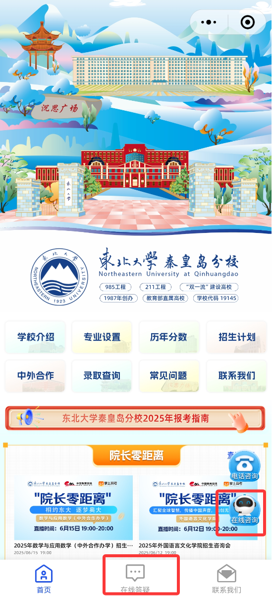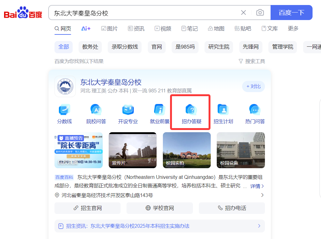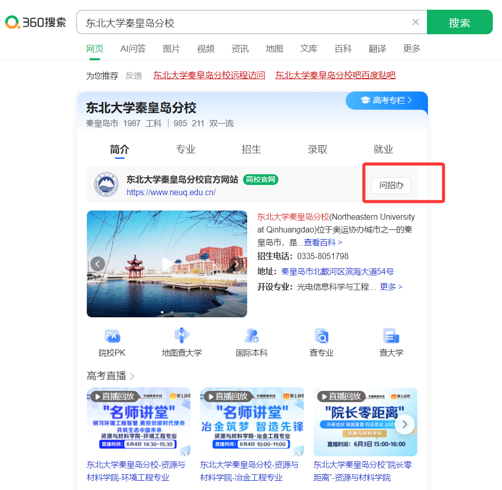 百度搜索、360搜索“东北大学秦皇岛分校”,首条出现学校卡片,点击“招办答疑”、“问招办”。