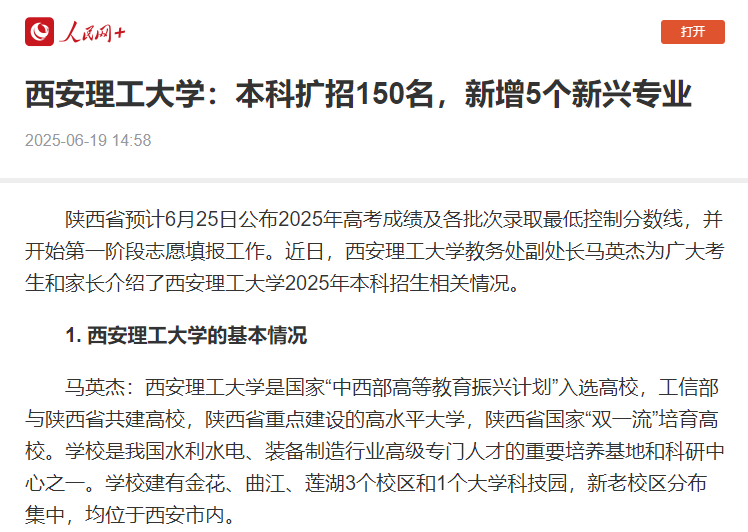 马英杰:2025年,西安理工大学持续优化本科招生结构,面向全国31个省份招收4640名本科生。我从三个方面谈一下今年的招生变化:首先,从招生计划来看,主要有五点变化,第一,总计划扩招150名;第二,陕西计划较去年增加41名;第三,新设拔尖创新人才计划60名;第四,卓越班计划扩增至618名;第五,优势热门专业持续扩增在陕计划:电气工程及其自动化扩增至230名、水利水电工程(卓越班)扩增至123名、自动化(卓越班)扩增至95名等。