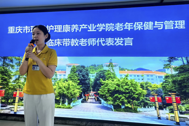 典礼上,青杠老年护养中心临床教学负责人侯春秀老师全面回顾了见习周期内的课程体系构建、实践教学成果及学生职业能力成长轨迹,生动诠释了校企协同育人的成效与意义。随后,师生代表分别以“实践中的成长故事”为主题分享了在此期间的收获与感悟,引发全场共鸣。