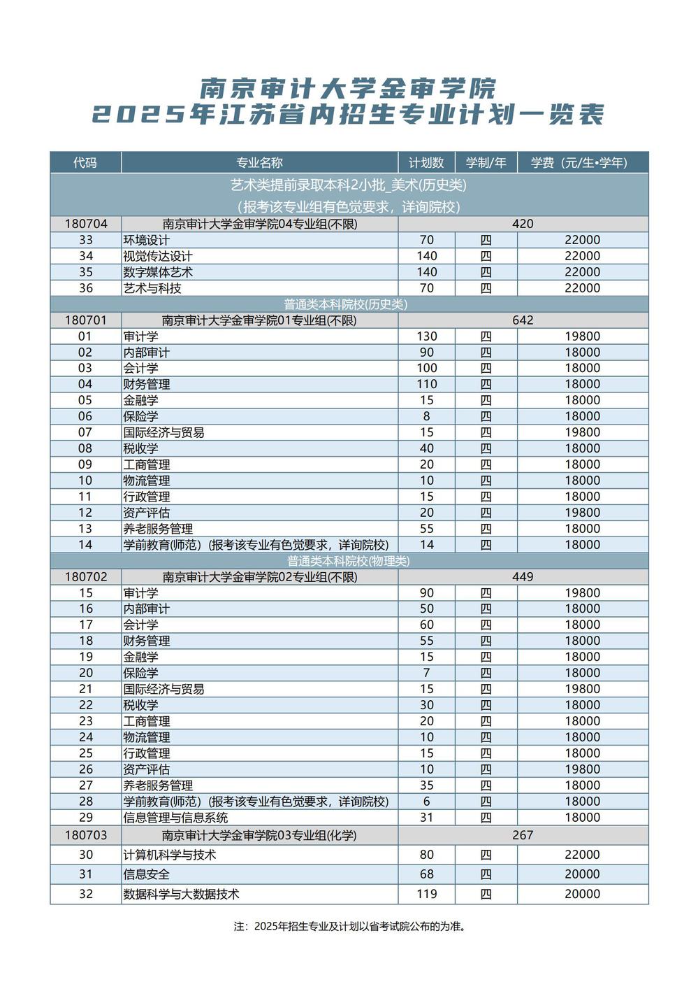 南京审计大学金审学院 2025年江苏省招生专业计划一览表