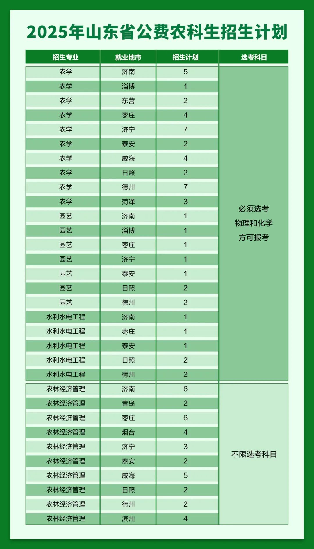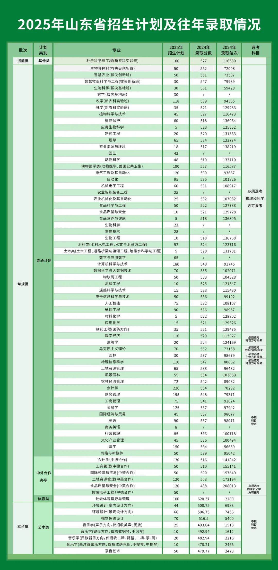 山东农业大学2025年面向山东、北京、天津、河北、山西、内蒙古、辽宁、吉林、黑龙江、江苏、浙江、安徽、福建、江西、河南、湖北、湖南、广东、广西、海南、重庆、四川、贵州、云南、陕西、甘肃、青海、宁夏、新疆、西藏30个省(自治区、直辖市)和台港澳地区招收7280人,全部为本科计划。