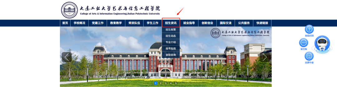大连工业大学艺术与信息工程学院 http://www.caie.edu.cn/,点击首页中“招生资讯”一栏,了解学校招生政策、招生动态、专业介绍、报考指南、录取查询等信息。