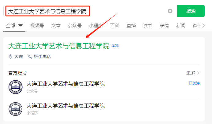 微信搜索:公众号中搜索“大连工业大学艺术与信息工程学院”,官方微信号“gdyxgfgzh”,或直接扫描下方二维码、点击公众号名片,进行关注。
