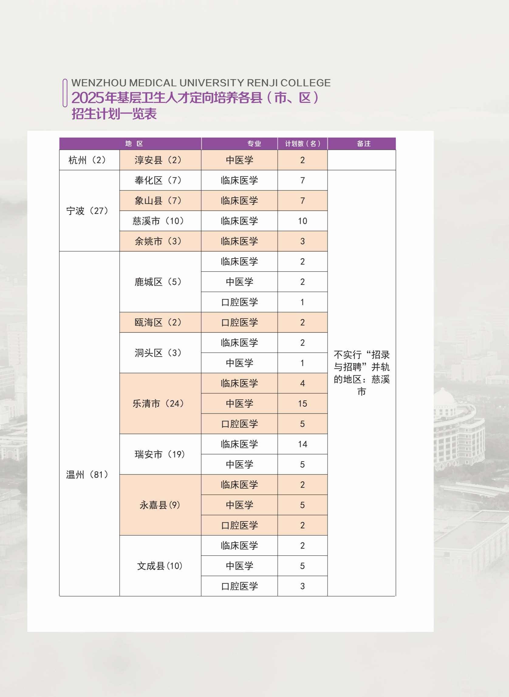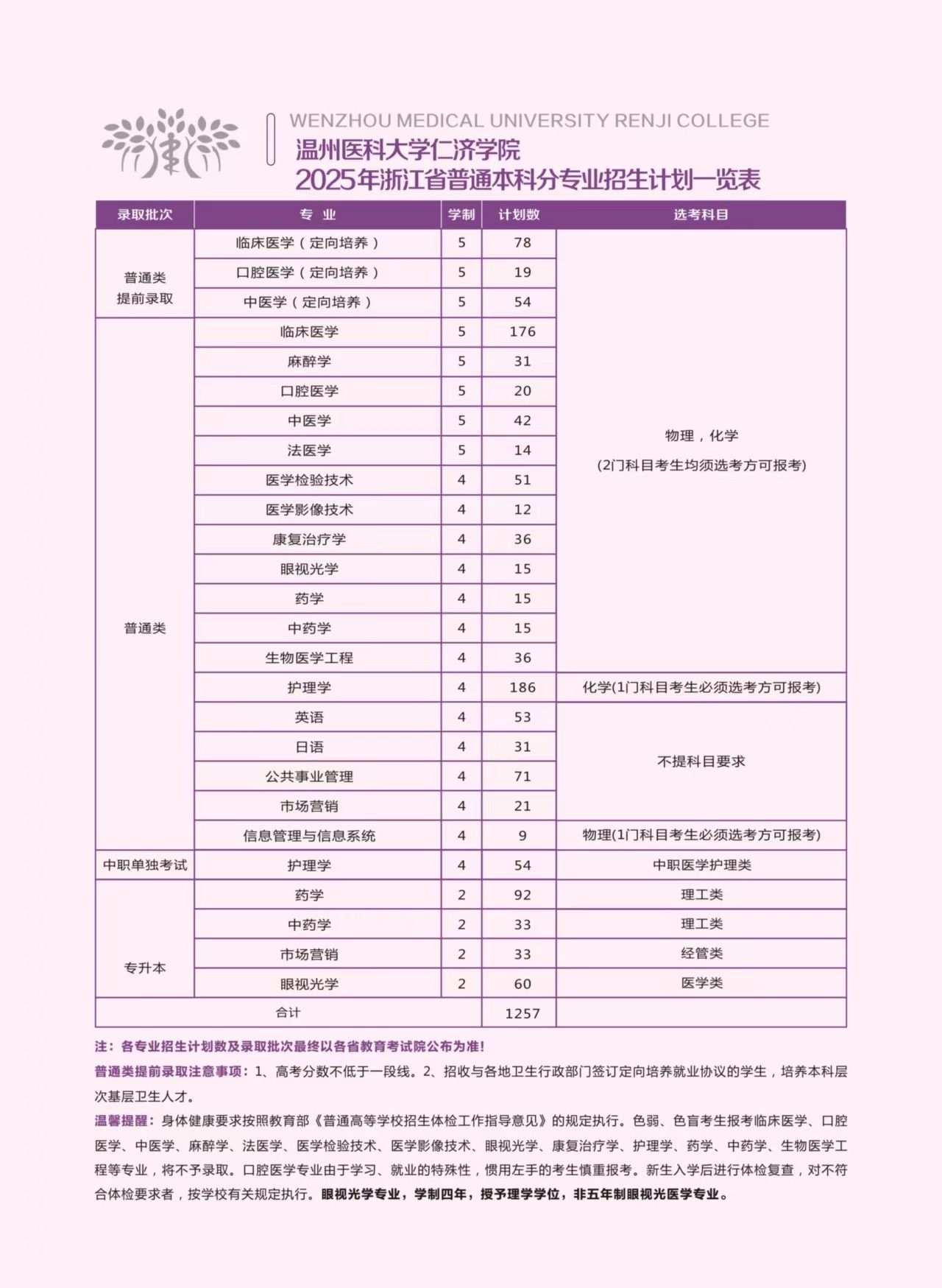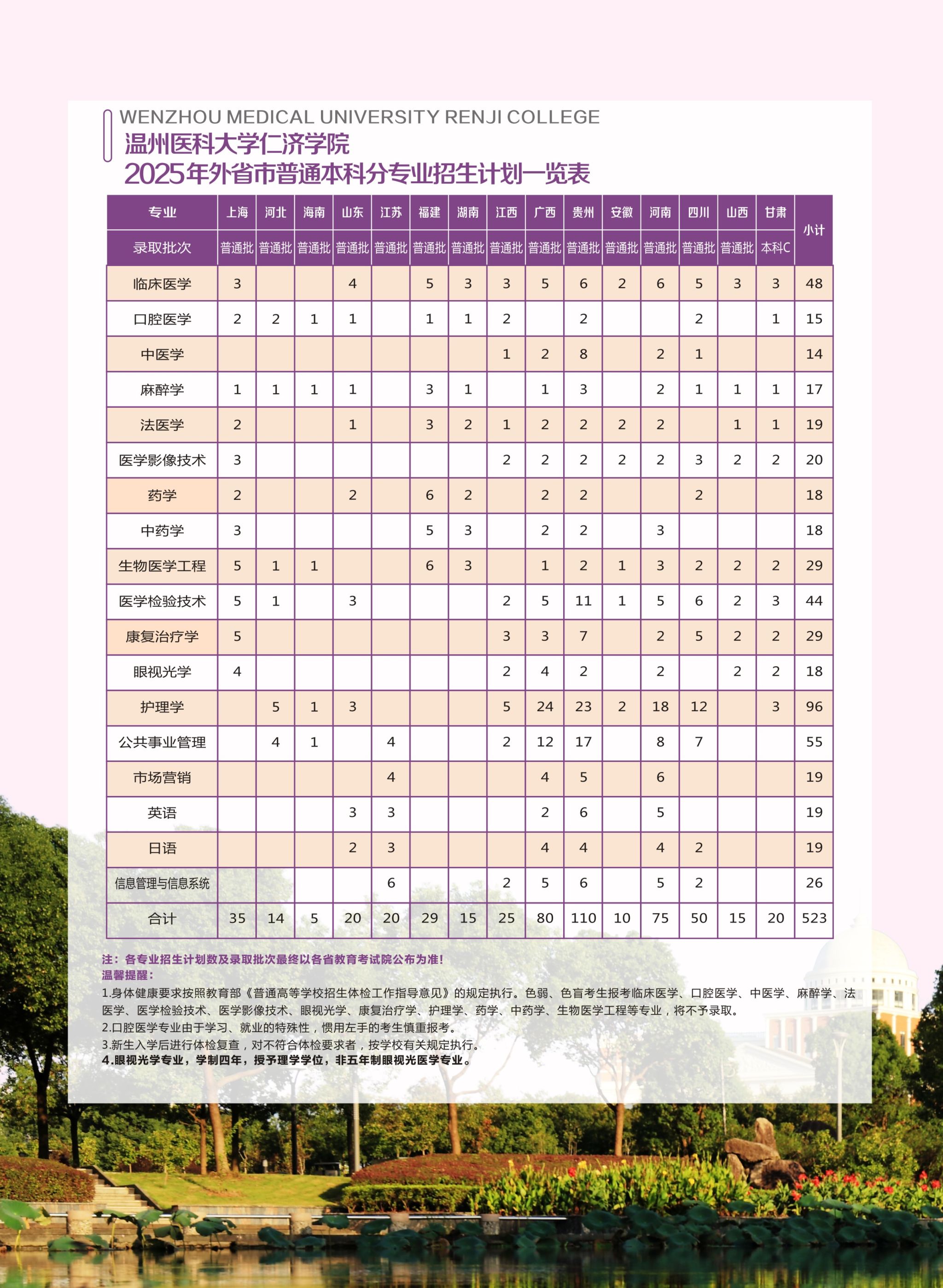 我校2025年普通本科计划招生1780人,其中浙江省内1257人,包括普通类提前批(基层卫生人才定向培养)151人,普通类平行批834人,中职单独考试54人,专升本218人。面向浙江省以外的15个省(直辖市、自治区)计划招生523人。