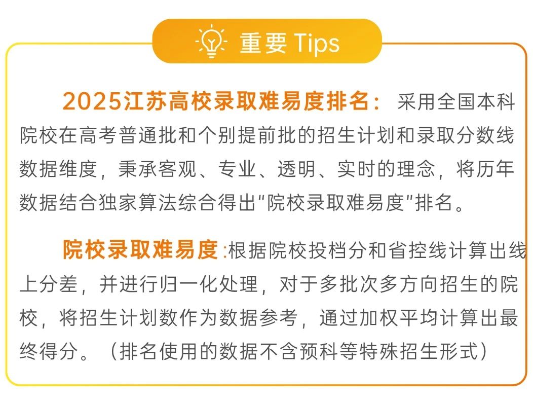 江苏作为长三角经济的强劲引擎,高校资源丰富,211高校和双一流大学数量在全国位居第二,为毕业生提供了广阔的就业空间。传统产业、高新技术产业以及金融、文化等多领域蓬勃发展,为不同专业的毕业生创造了丰富的机会。正值高考志愿填报的关键时期,现为大家揭晓2025年江苏省大学易度排名,助力考生精准填报。