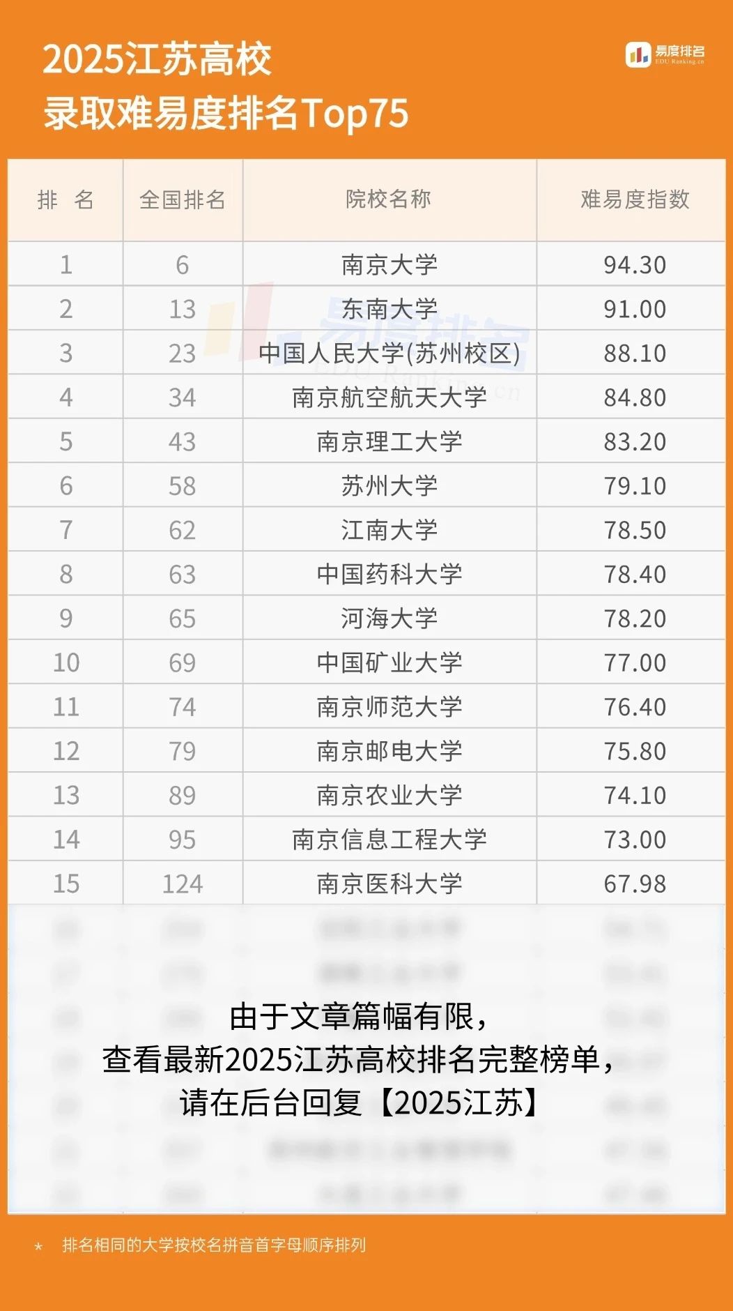 各分段考生可根据难易度指数选择适合自己的学校。如需查看75所院校的完整榜单,可关注【易度排名】公众号,后台私信回复“2025江苏”。