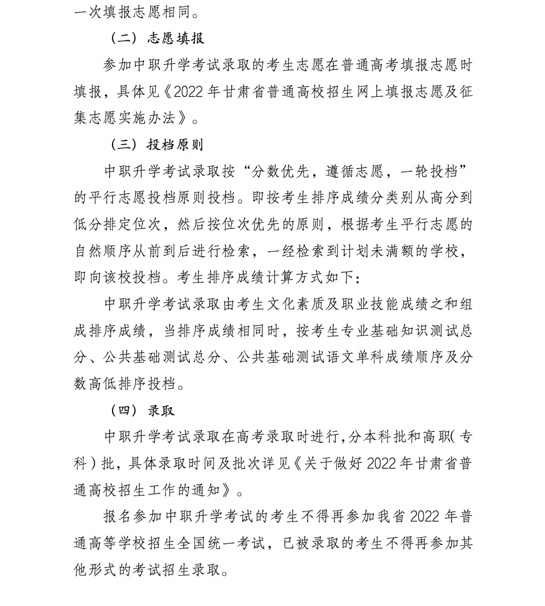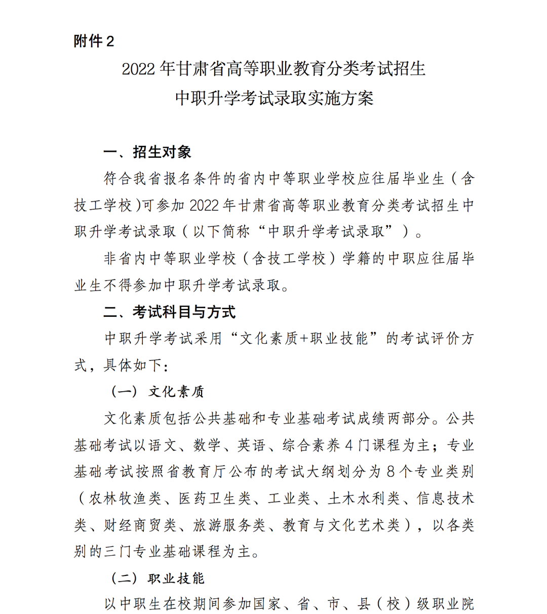 2.2022年甘肃省高等职业教育分类考试招生中职升学考试录取实施方案