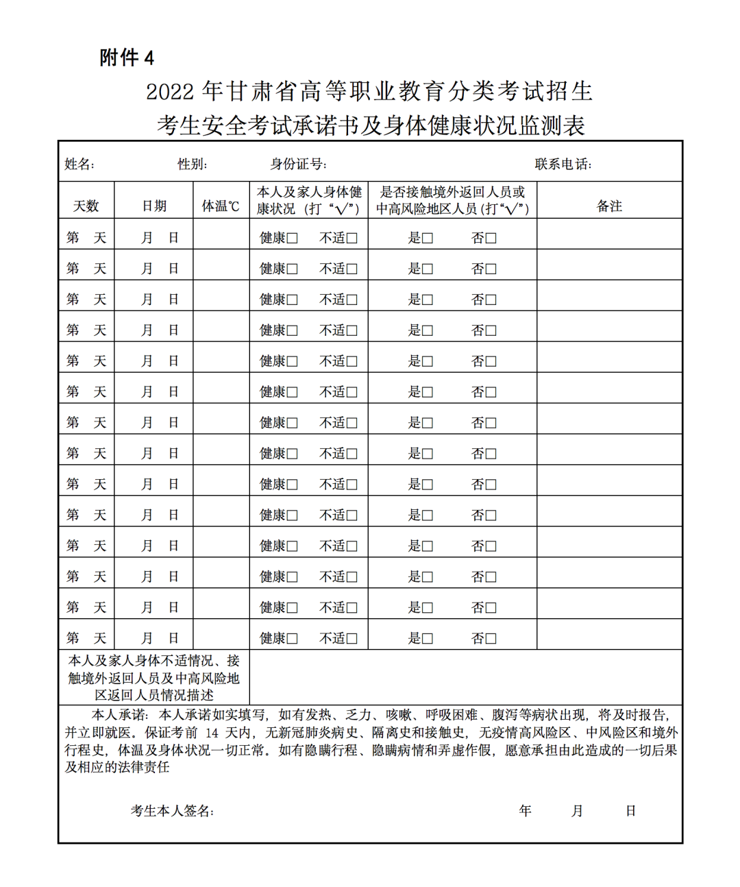 4.2022年甘肃省高等职业教育分类考试招生考生安全考试承诺书及身体健康状况监测表