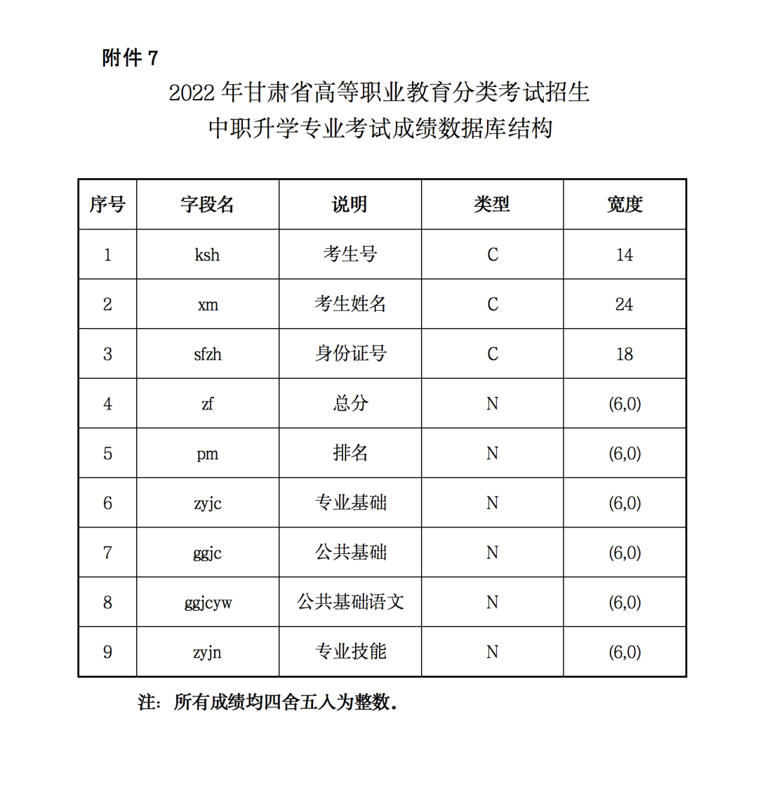 7.2022年甘肃省高等职业教育分类考试招生中职升学考试成绩数据库结构