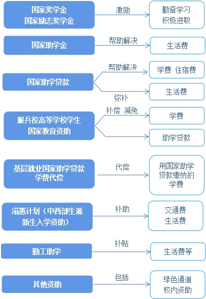 国家和我省在高等教育本专科阶段建立起国家奖学金、国家励志奖学金、国家助学金、国家助学贷款等多种形式有机结合的高校学生资助政策体系。