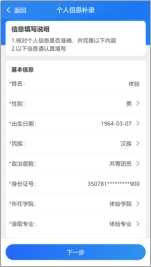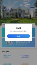 4.登录成功后,账号处于未认证状态,首先输入身份证号,点击“去认证”,选择自己学校 ,输入学生自己的身份证号,进行认证。认证成功后,进入系统首页,点击“新生线上报到”,进入新生报到流程,点击资料填报环节,填写基本信息完成注册。