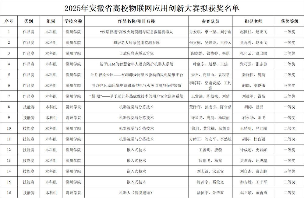 日前,2025年安徽省高校物联网应用创新大赛落下帷幕。滁州学院师生在众多参赛队伍中脱颖而出,获一等奖6项、二等奖5项、三等奖5项,6位教师获得优秀指导教师称号。