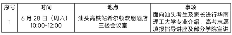 华南理工大学汕头招生组将于6月26日下午--6月28日在汕头高铁站希尔顿欢朋酒店(酒店大堂)接收汕头考生及家长一对一高考志愿填报咨询。请需要的考生及家长填写预约,并凭预约码按时前往咨询。
