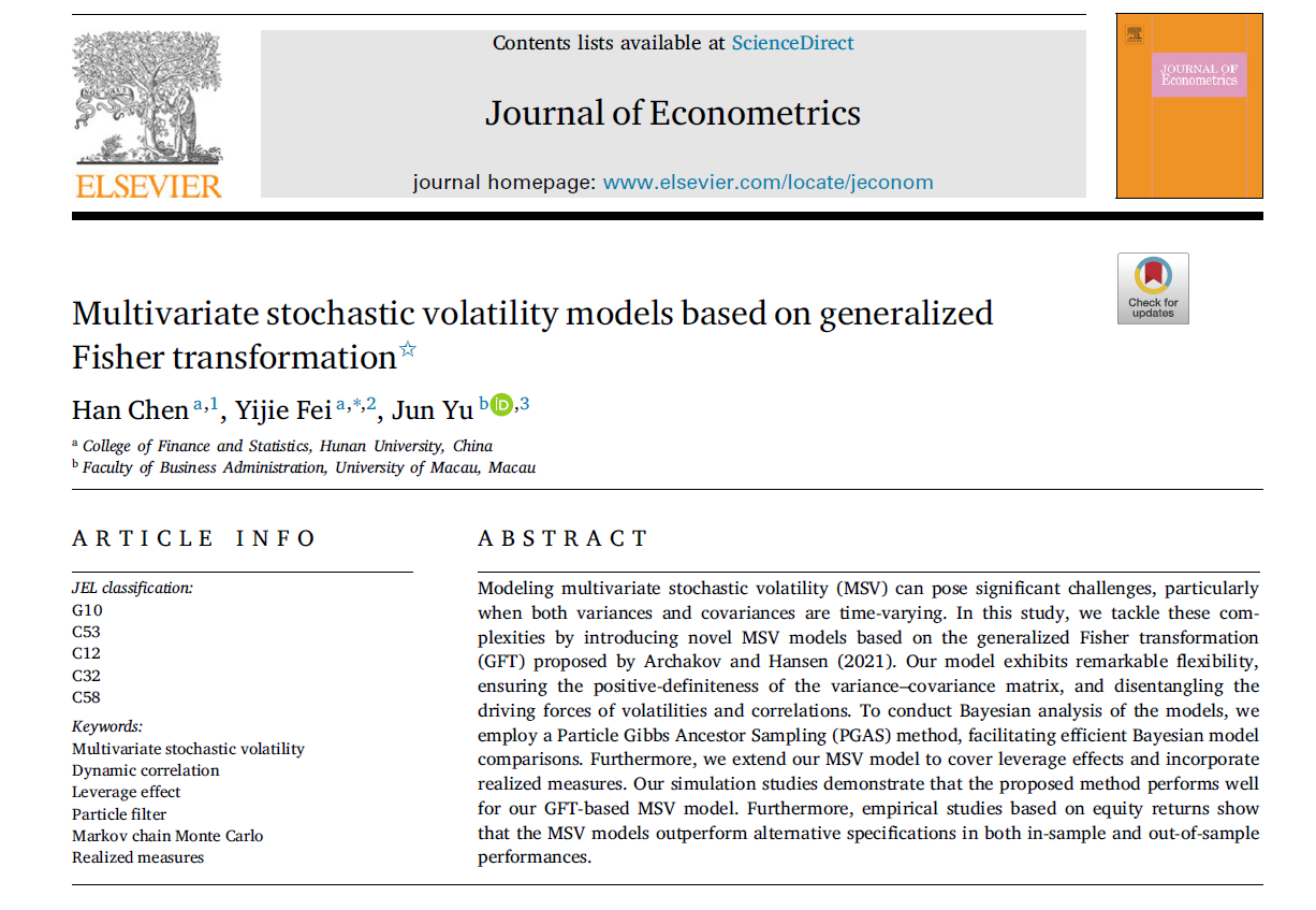 近日,金融与统计学院陈汉助理教授、费毅捷助理教授合作完成的学术论文“Multivariate stochastic volatility models based on generalized Fisher transformation”在计量经济学国际顶尖期刊Journal of Econometrics在线发表。
