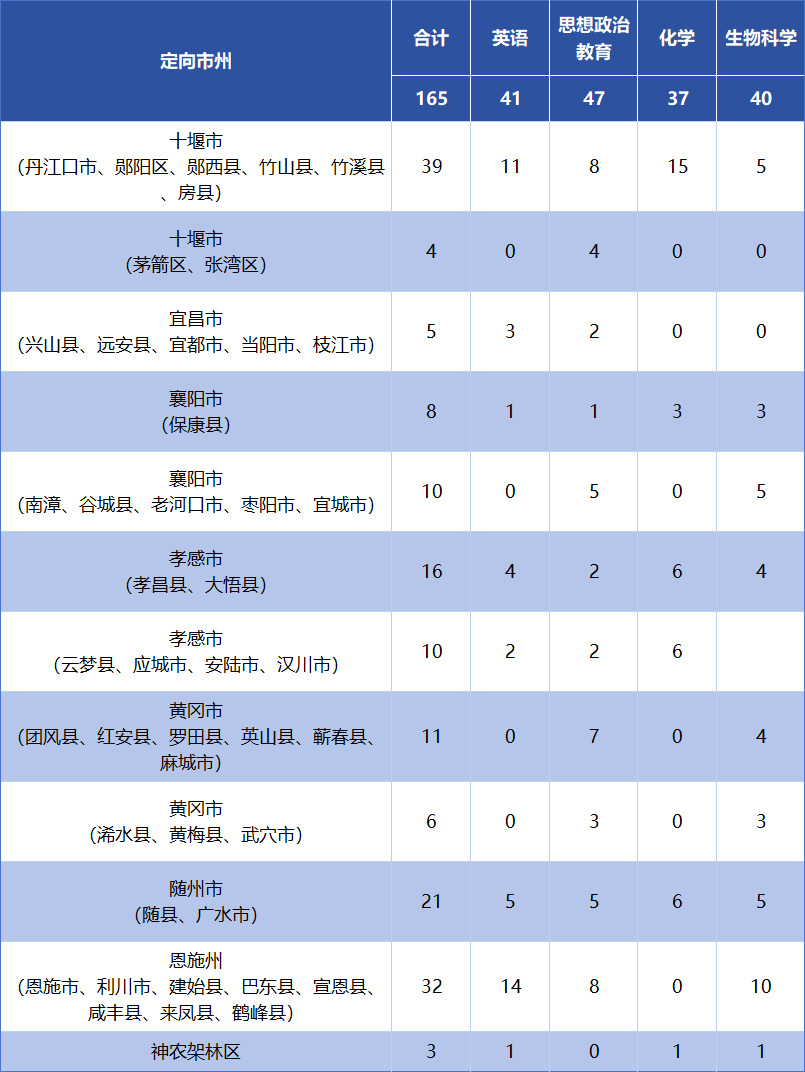 根据《教育部办公厅关于做好2021年中西部优秀教师定向培养工作的通知》(教师厅【2021】3号)文件和湖北省教育厅安排,湖北师范大学2025年继续承担湖北省“荆楚优师计划”培养任务,面向湖北省择优招收本科定向就业师范生,采取在校学习期间免除学费、免缴住宿费并补助生活费的方式,为我省部分地区定向培养志存高远、乐教适教的基础教育高素质师资和未来教育家。