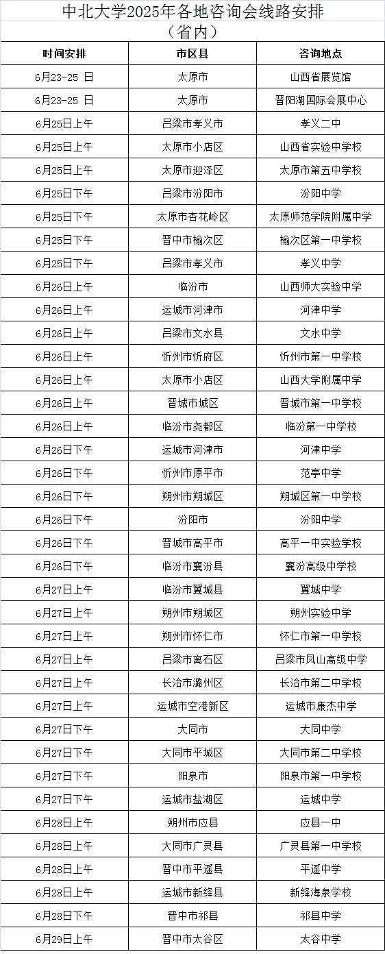 以上各省咨询安排为跟随相关机构的行程,供各位考生及家长参考,个别时间及地点如遇其他原因取消或更改,将不再通知。另外我校还将有老师赴山西各县区中学进行现场咨询答疑,欢迎大家及时关注并前去咨询!祝大家金榜题名!