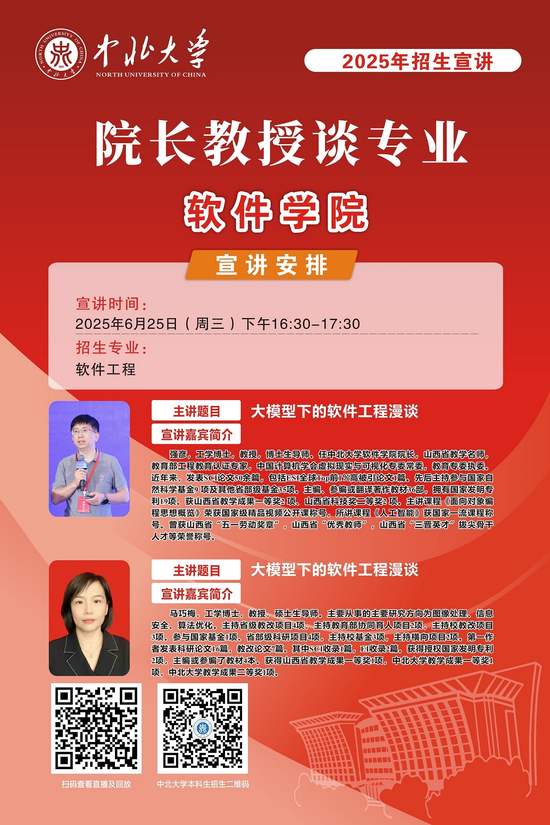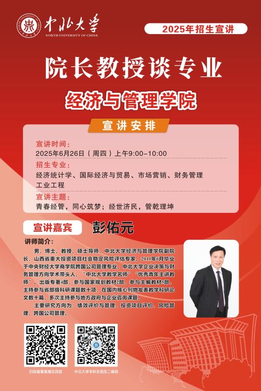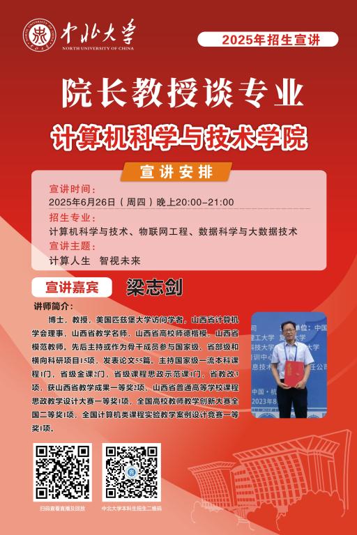 未来的大学学子们,你们已经完成了十二年寒窗苦读,完成了一次重要的人生答卷,即将开启人生新的征程。在这重要的人生十字路口,将会面临新的选择,为了让大家进一步了解中北大学,我们于6月25至28日特别推出 “院长教授谈专业”系列直播活动,由各院学术大咖们带你深入了解中北大学各专业情况,并现场与大家进行沟通交流,答疑解惑,一定记得届时扫码观看哦!