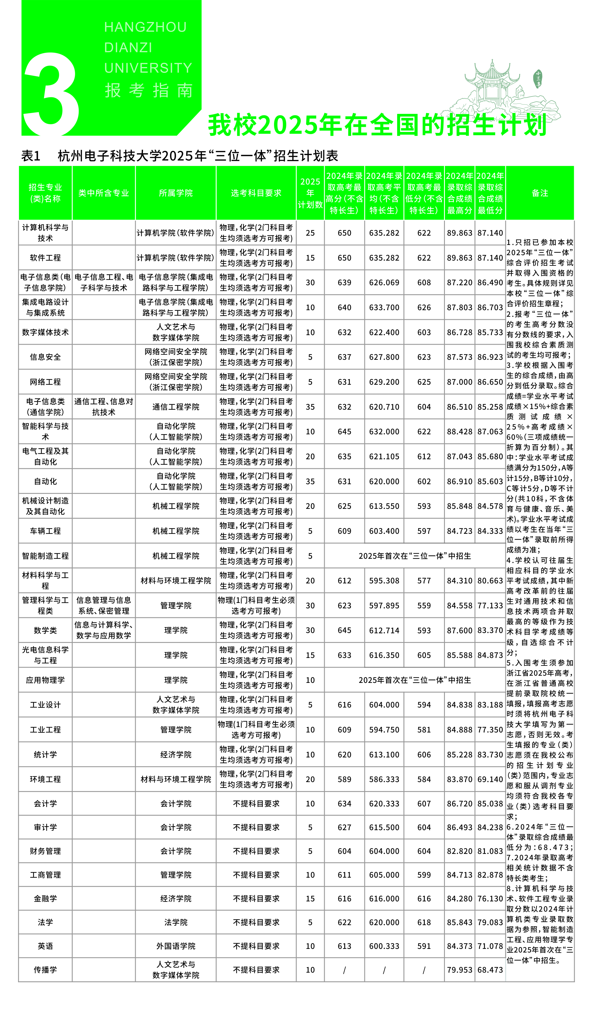 答:2025年我校在浙江省的招生总计划为2833人,比去年增加了210人,在三位一体的招生计划为450人。浙江省内考生选择杭电的机会进一步加大!浙江省普通类增量安排在卓越学院的3个专业(