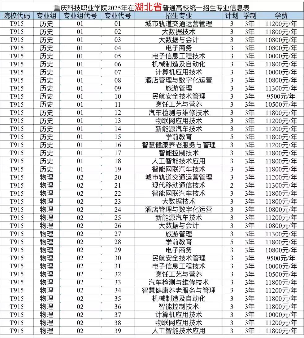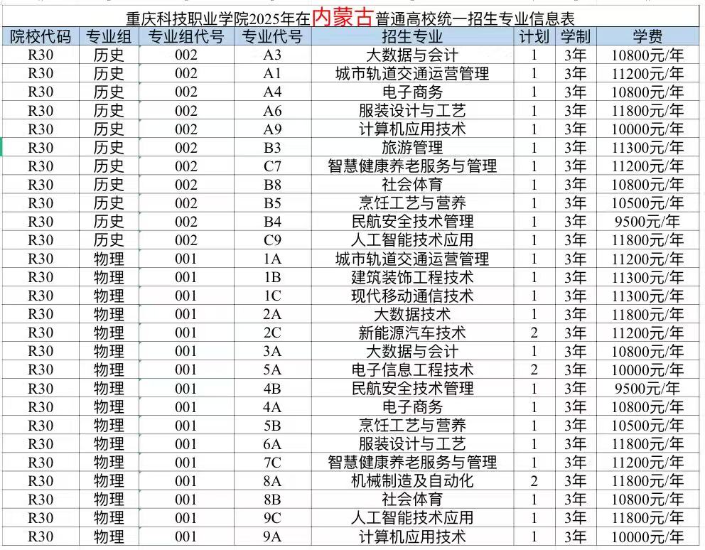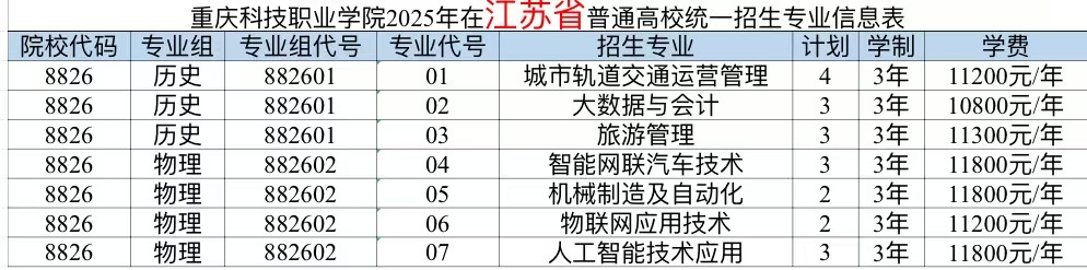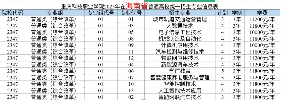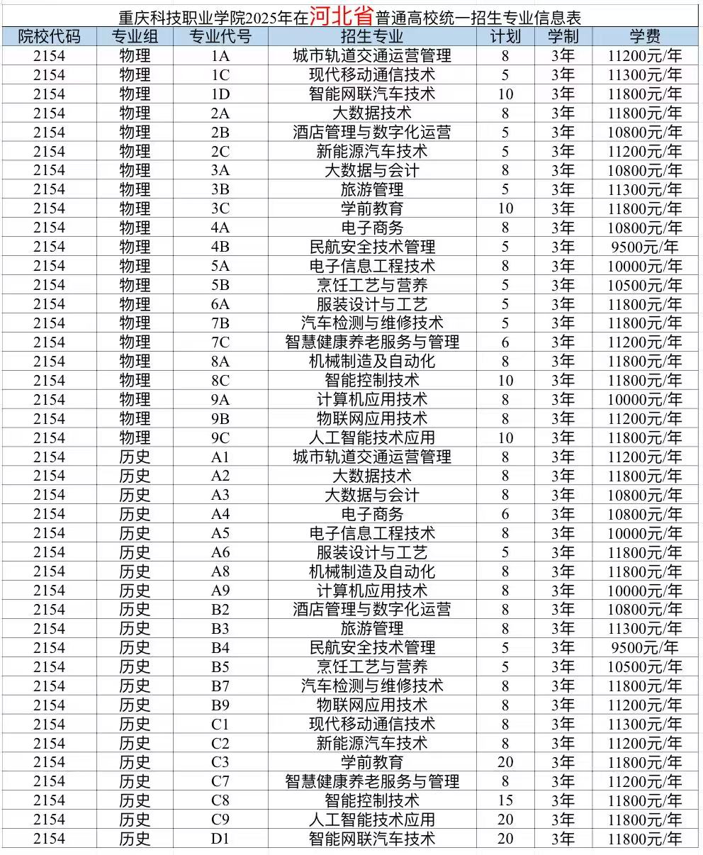 重庆科技职业学院2025年计划面向重庆、河北、江苏、浙江、安徽、福建、江西、山东、河南、湖北、湖南、广西、四川、贵州、云南、青海、新疆、广东、内蒙古、海南、黑龙江21个省市招生,考生填报志愿时,院校代号(码)、院校专业组及代号、专业代号请参照各省(自治区、直辖市)公布的为准。