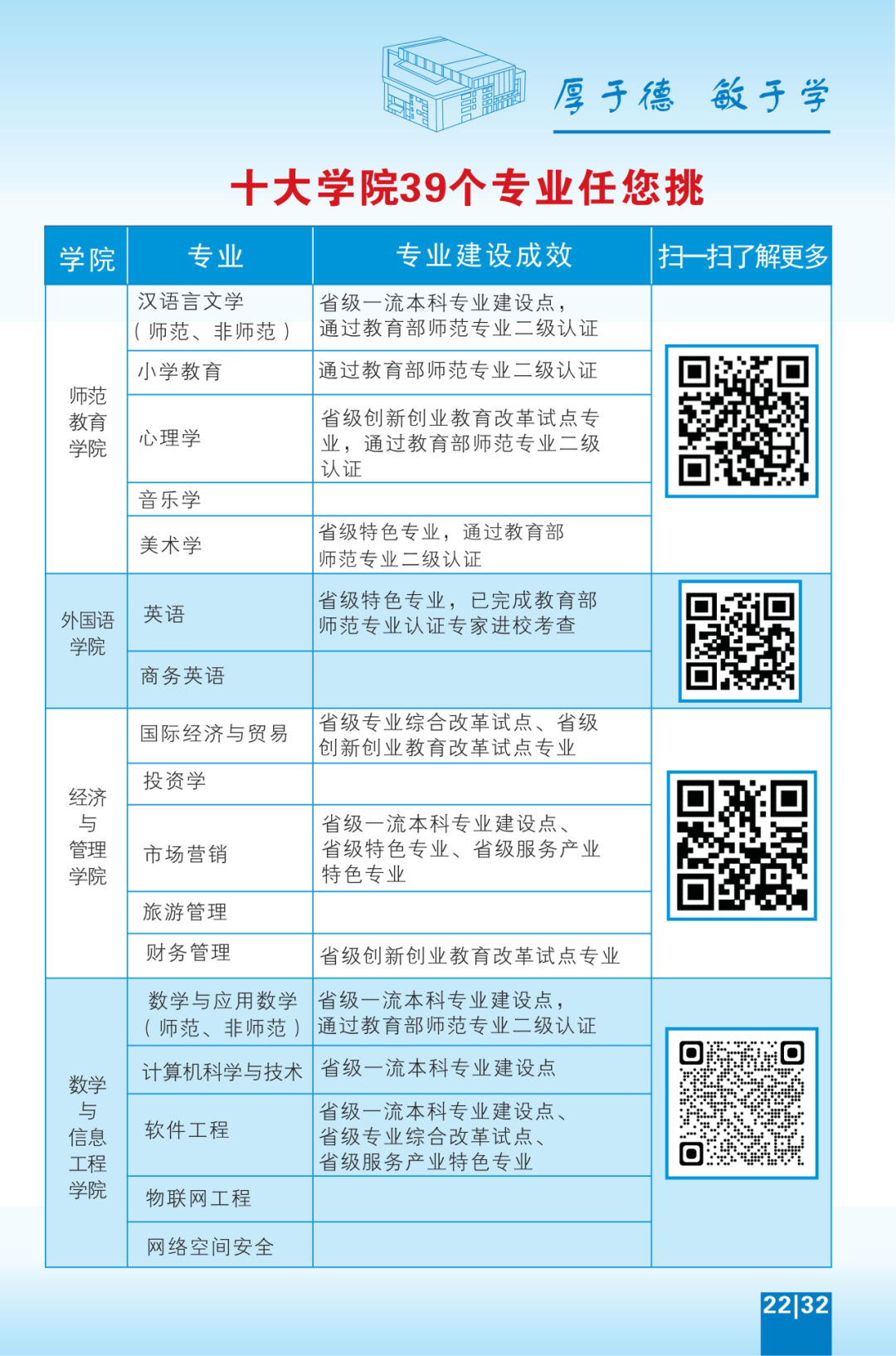 构建“以文理为基础,做强应用学科、做精教育学科”的“一体两翼”学科专业布局。现有硕士学位授权点3个,本科专业43个,国家级特色专业1个,国家级综合改革试点专业1个,省级一流本科专业建设点13个、省级特色专业7个、省级服务产业特色专业7个,通过师范类专业第二级认证7个;国家级一流本科课程2门,省级一流本科课程55门、省级精品课程11门,省级课程思政示范课程6门,省级实验教学示范中心8个、省级虚拟仿真实验教学中心4个,省级人才培养模式创新实验区5个,省级现代产业学院2个;省级课程思政教学研究中心1个,省高校思想政治工作精品项目8个;高等教育省级教学成果奖18项。