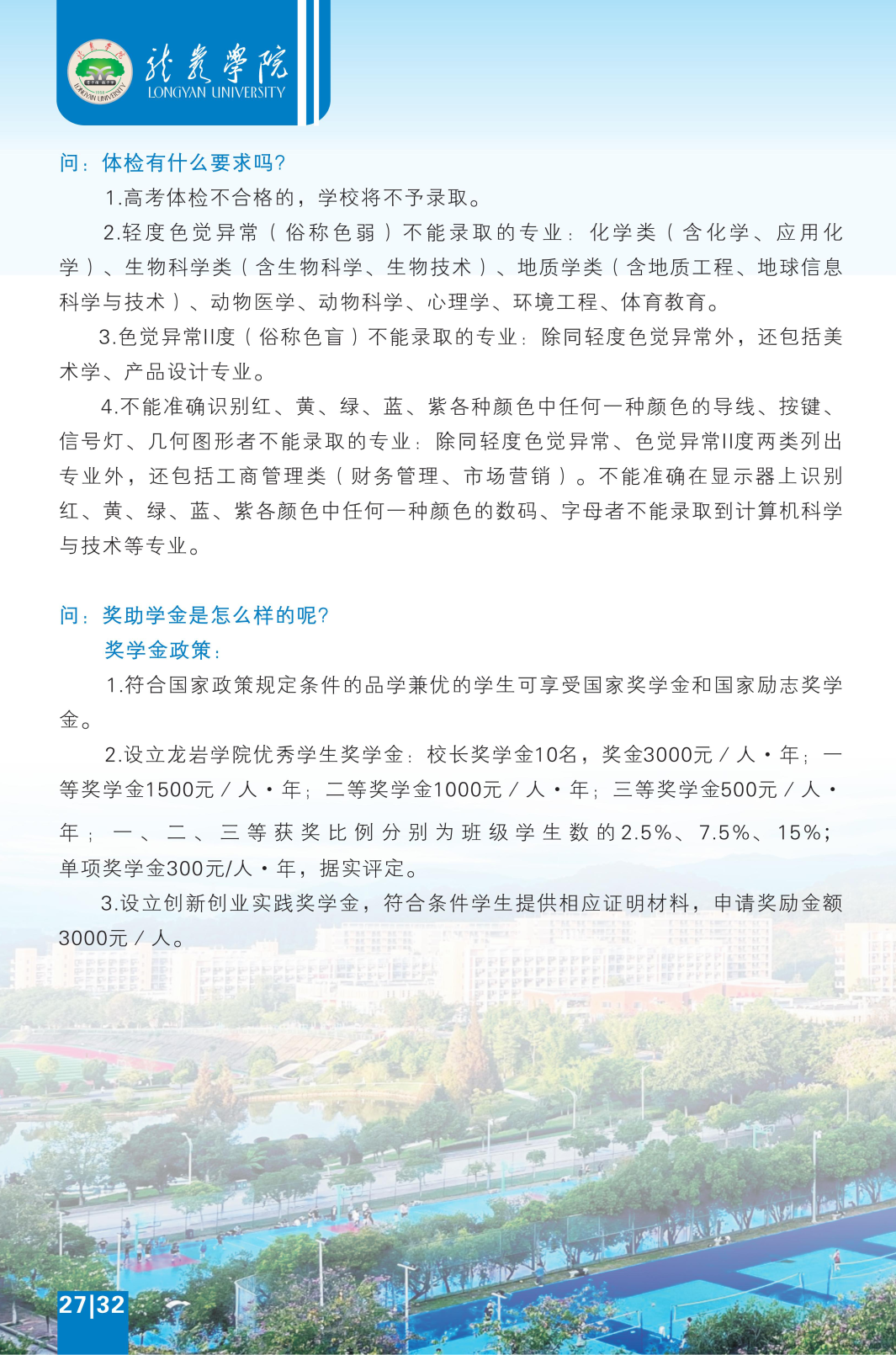 2.国家助学贷款:家庭经济特别困难的学生,入学前在生源地可申请办理生源地信用助学贷款。(学校接收助学贷款账号信息如下:户名:龙岩学院,开户行:中国农业银行新罗支行,账号:13-710101040000744)