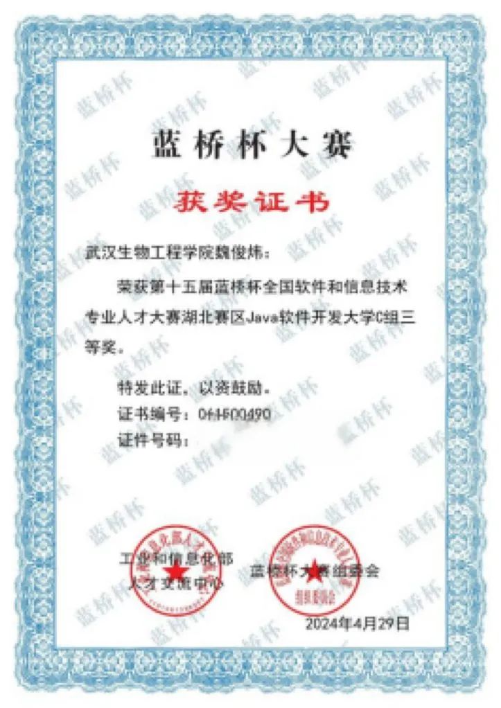 魏俊炜同学荣获第十五届蓝桥杯全国软件