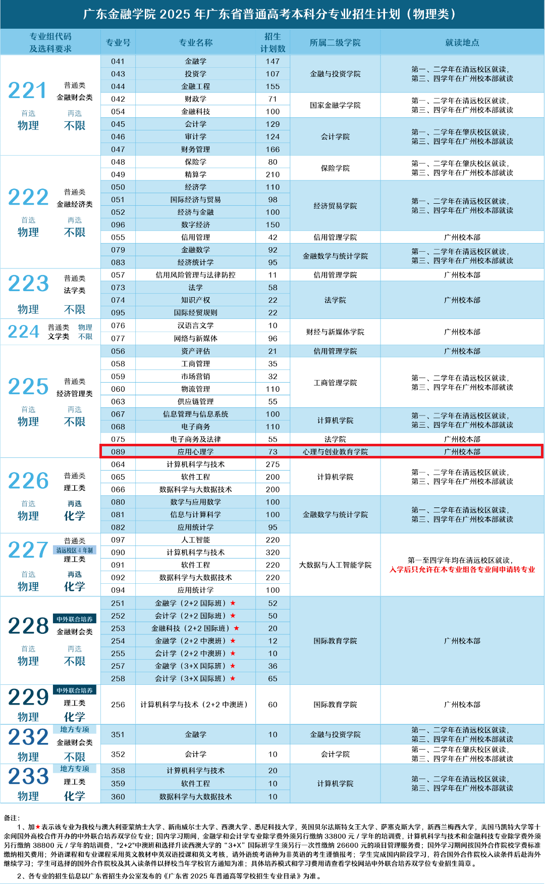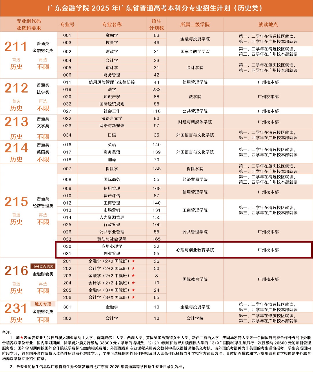 心理与创业教育学院2025年广东省高考招生计划数为160人,其中应用心理学专业在历史类和物理类均有招生,计划数105人,创业管理专业只在历史类招生,计划数55人,两个专业的大一新生四年均安排在广州校本部就读。招生专业组代码及选课要求请看下表:
